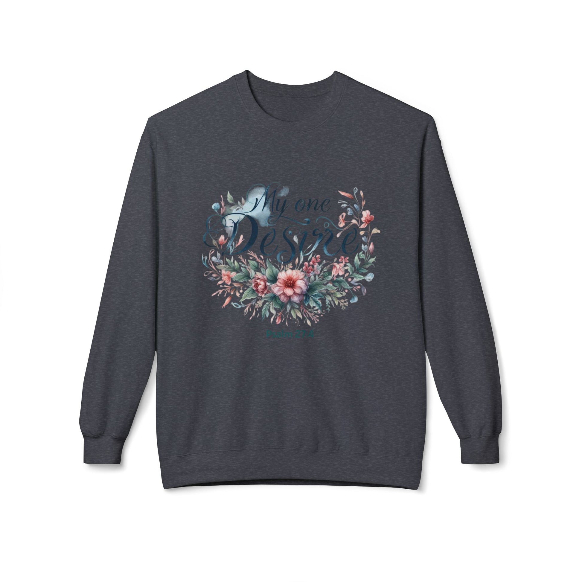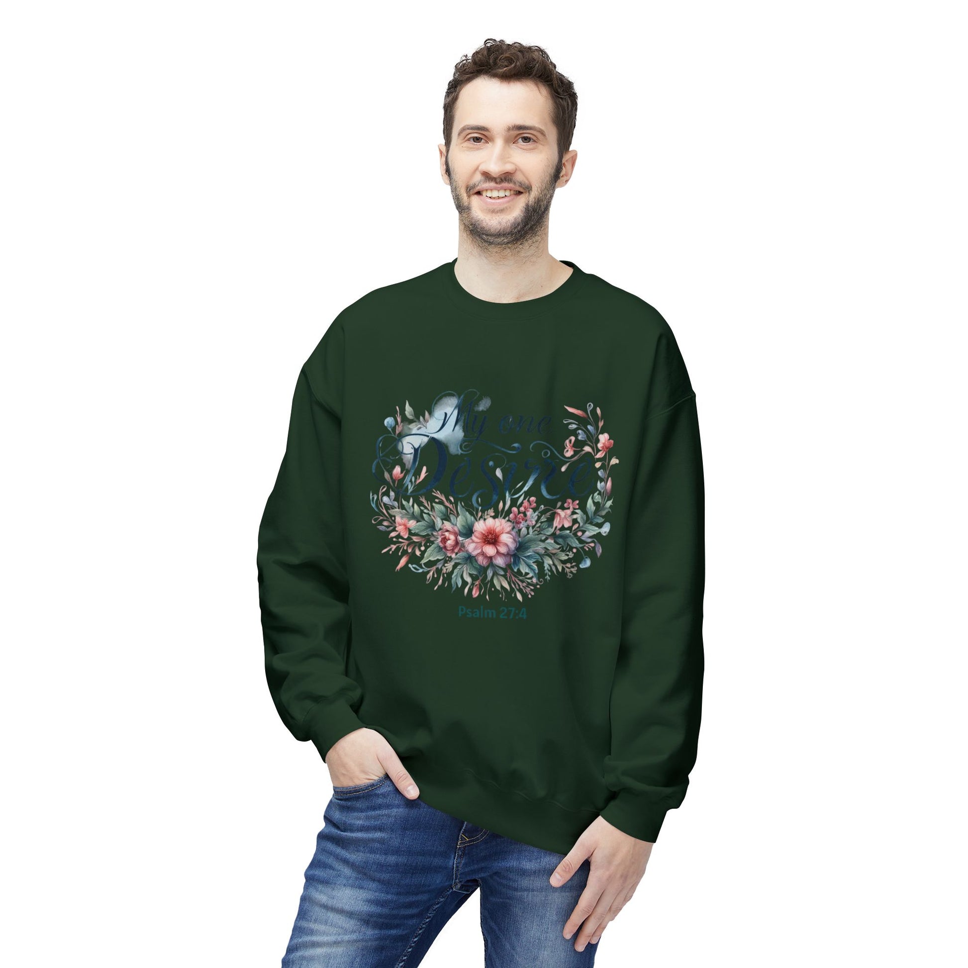 This Sweatshirt features the Bible verse Psalm 27:4 "My One Desire", giving off a comforting and uplifting vibe. Perfect for those looking to express their faith and spirituality in everyday wear. Ideal for Christians, church-goers, and believers. Relevant for religious holidays, Sunday services, and prayer gatherings.