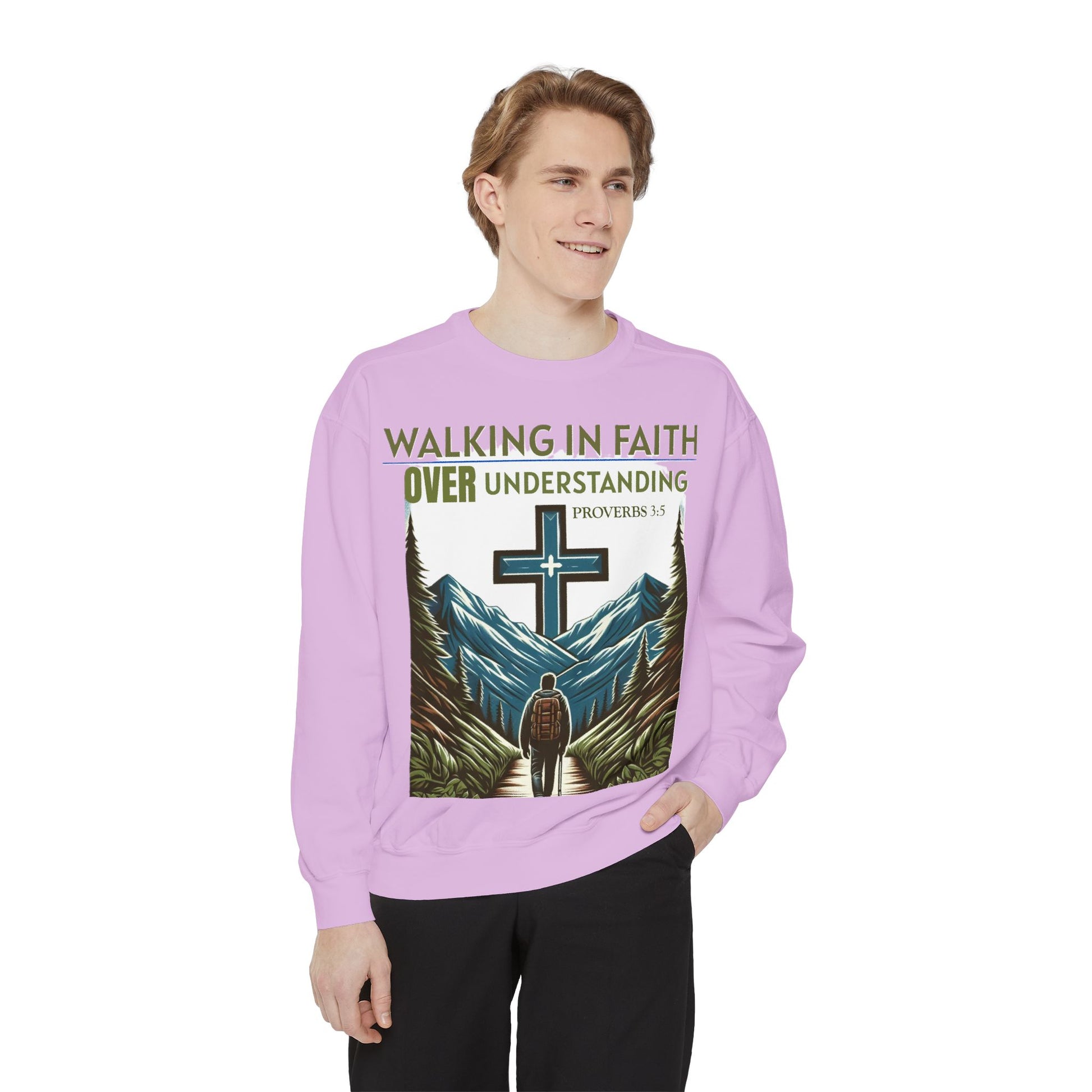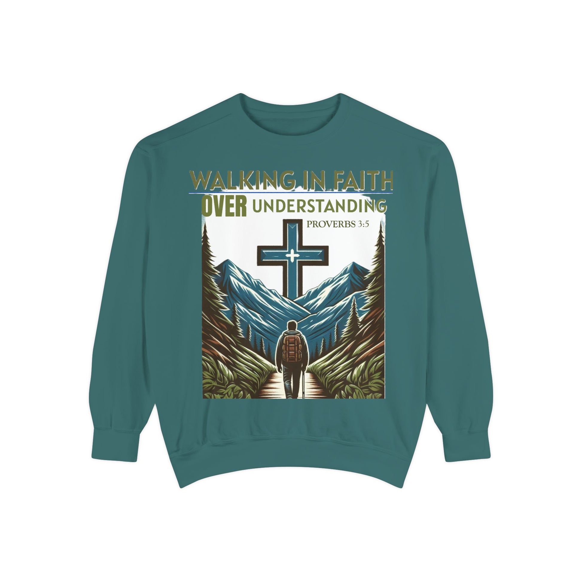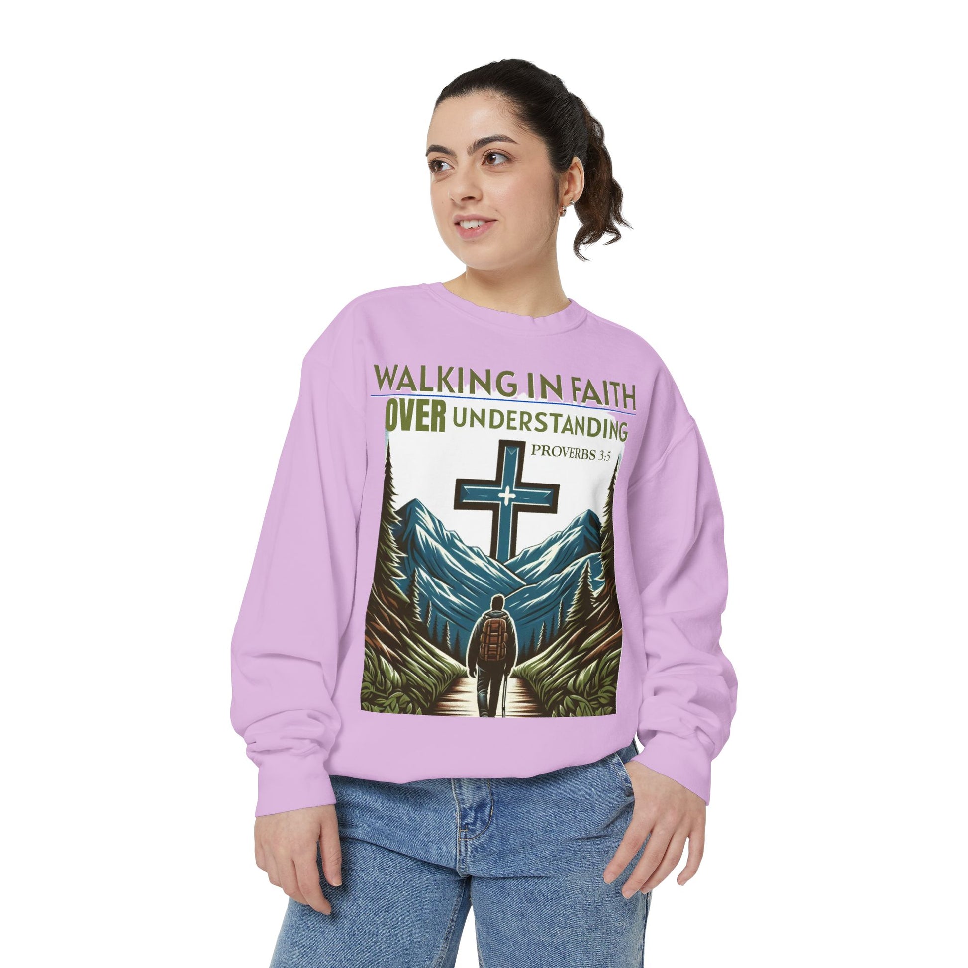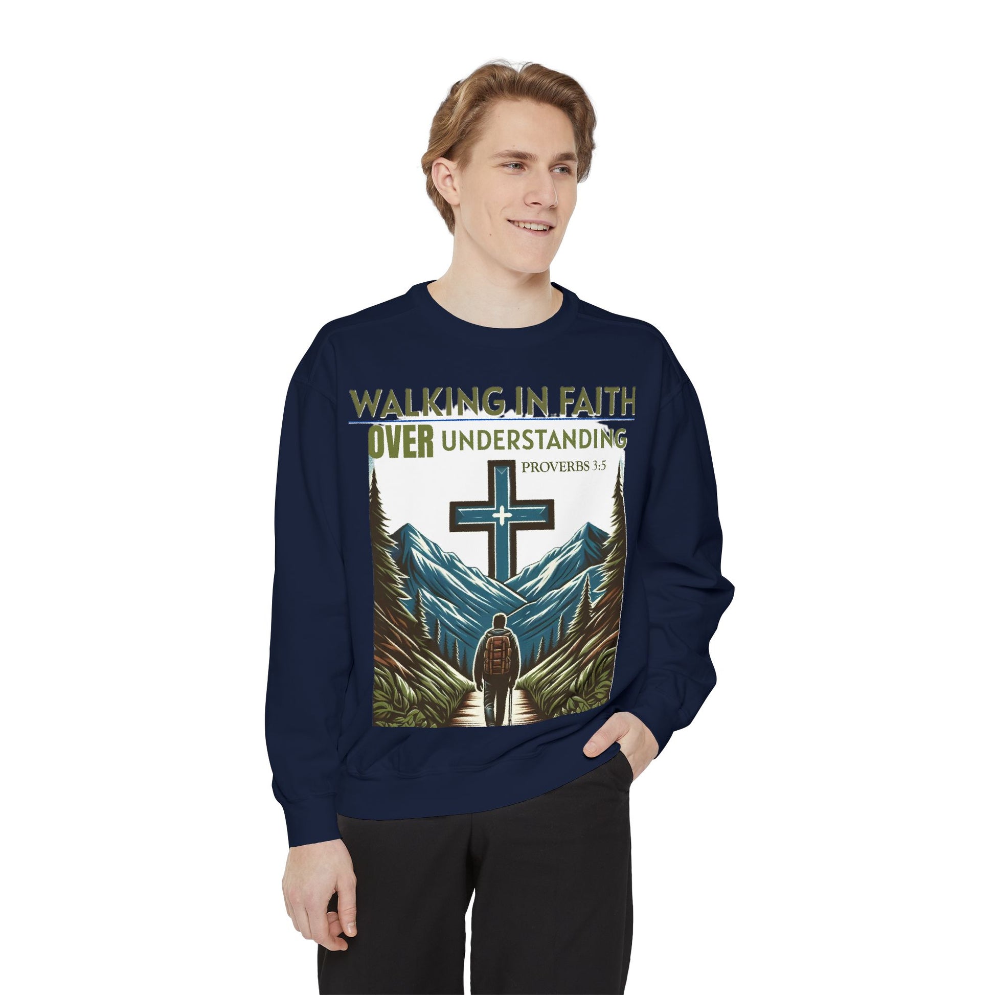 This Sweatshirt features a Bible verse, Proverbs 3:5 "WALKING IN FAITH OVER UNDERSTANDING". It provides a cozy and comfortable feel, perfect for those looking to showcase their faith in style. Ideal for individuals who value faith and spirituality, this sweatshirt is relevant for religious holidays, gatherings, and everyday wear.