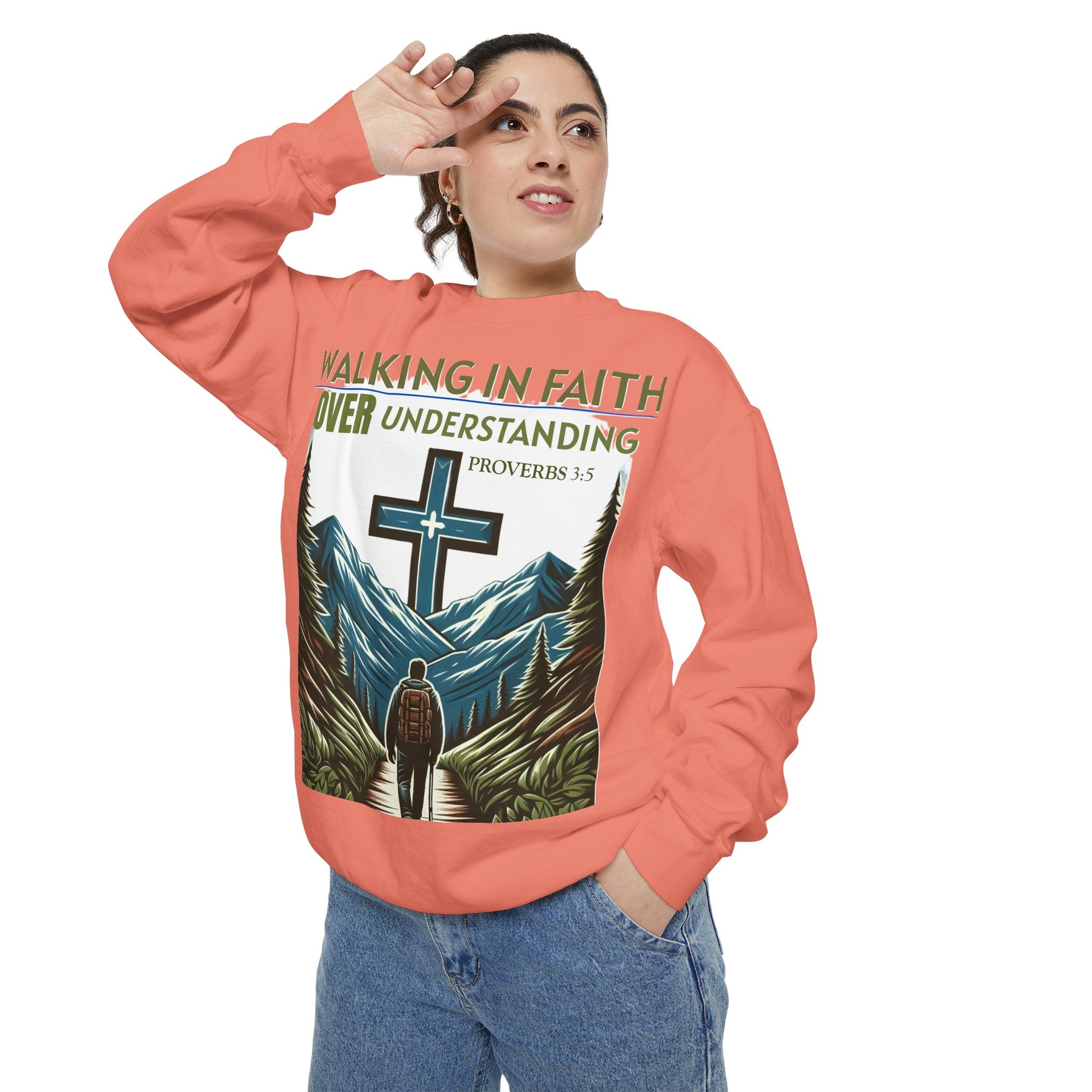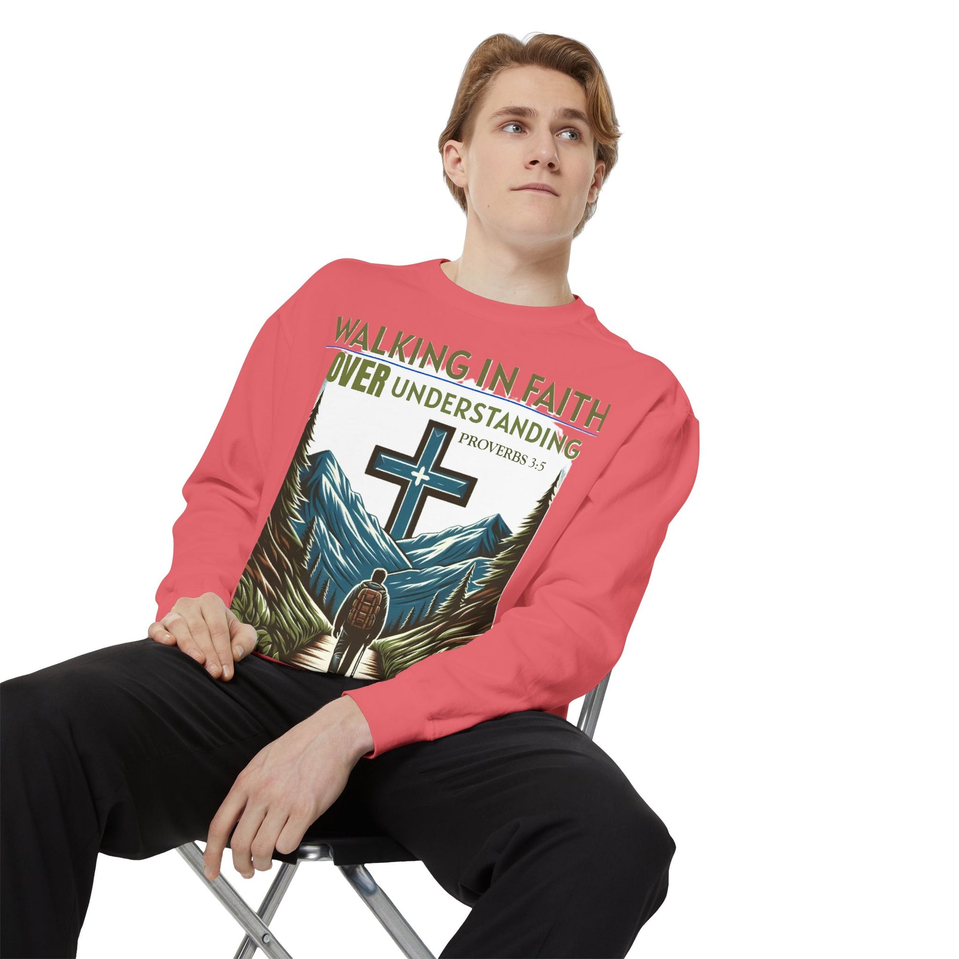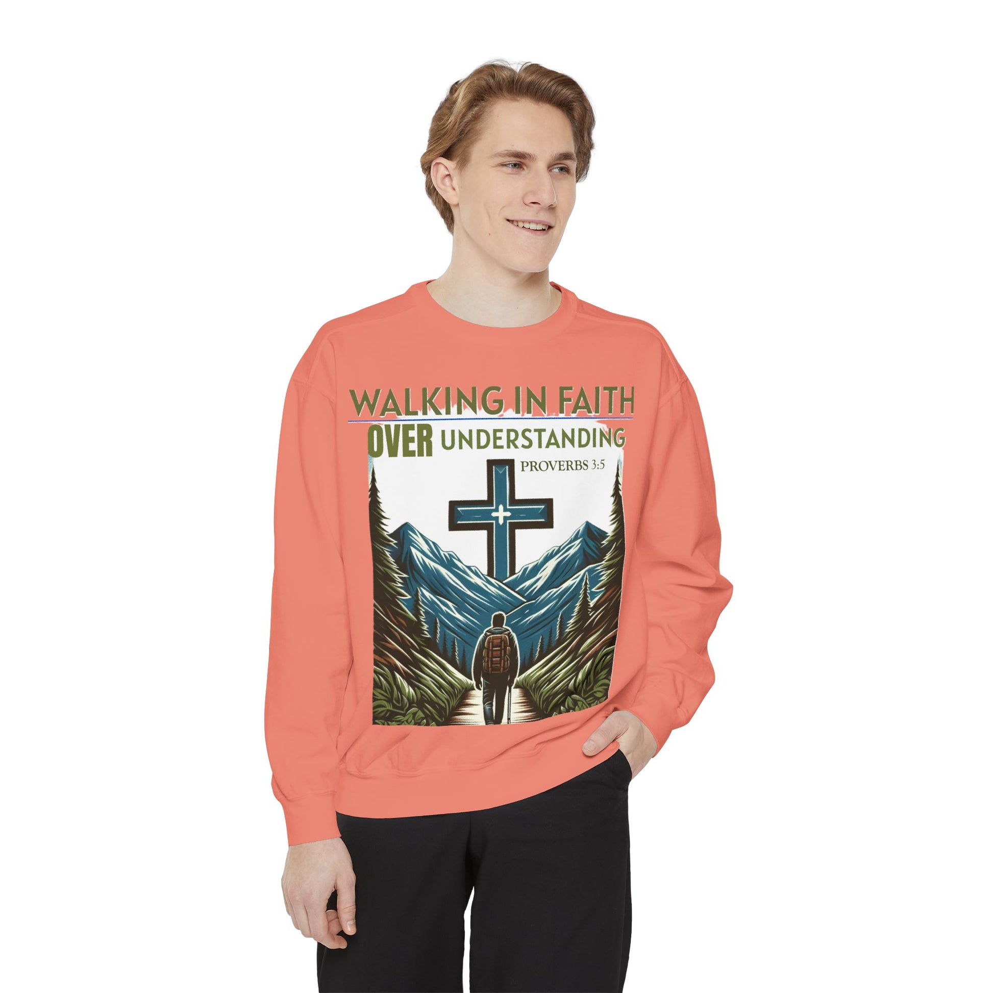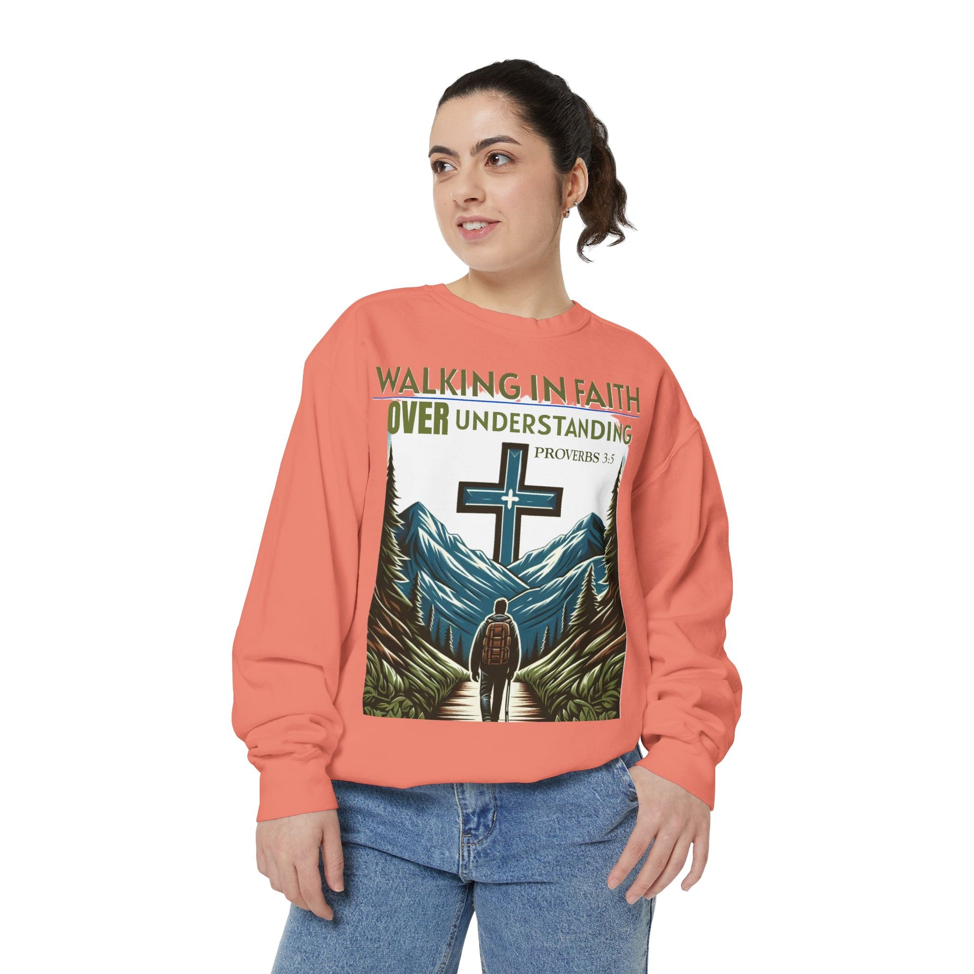 This Sweatshirt features a Bible verse, Proverbs 3:5 "WALKING IN FAITH OVER UNDERSTANDING". It provides a cozy and comfortable feel, perfect for those looking to showcase their faith in style. Ideal for individuals who value faith and spirituality, this sweatshirt is relevant for religious holidays, gatherings, and everyday wear.