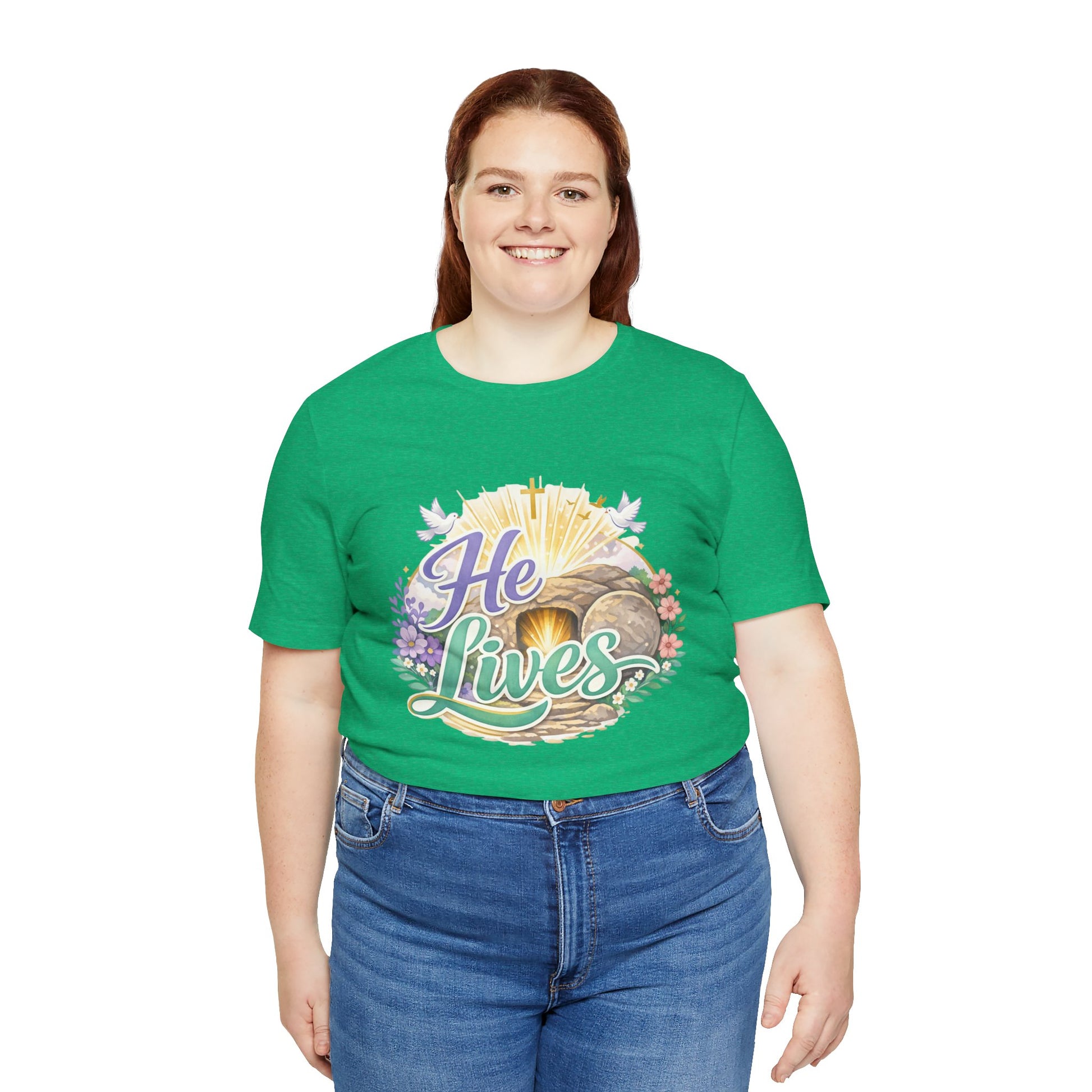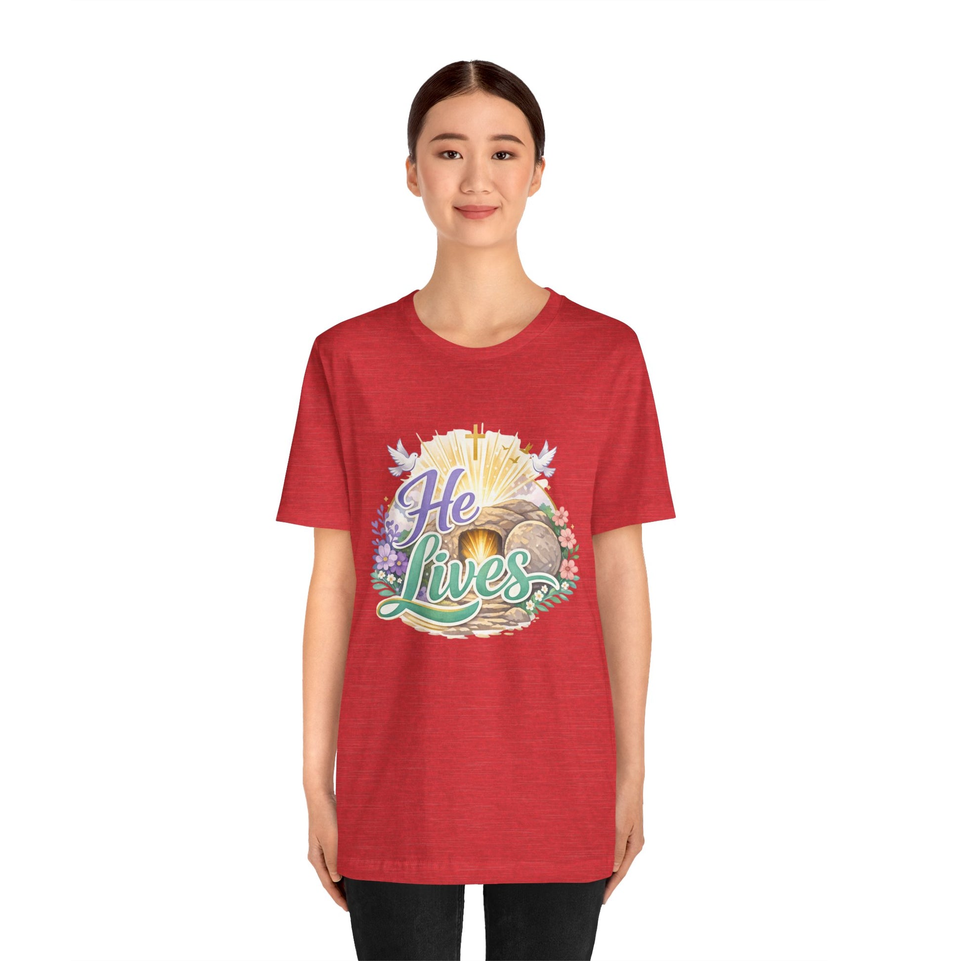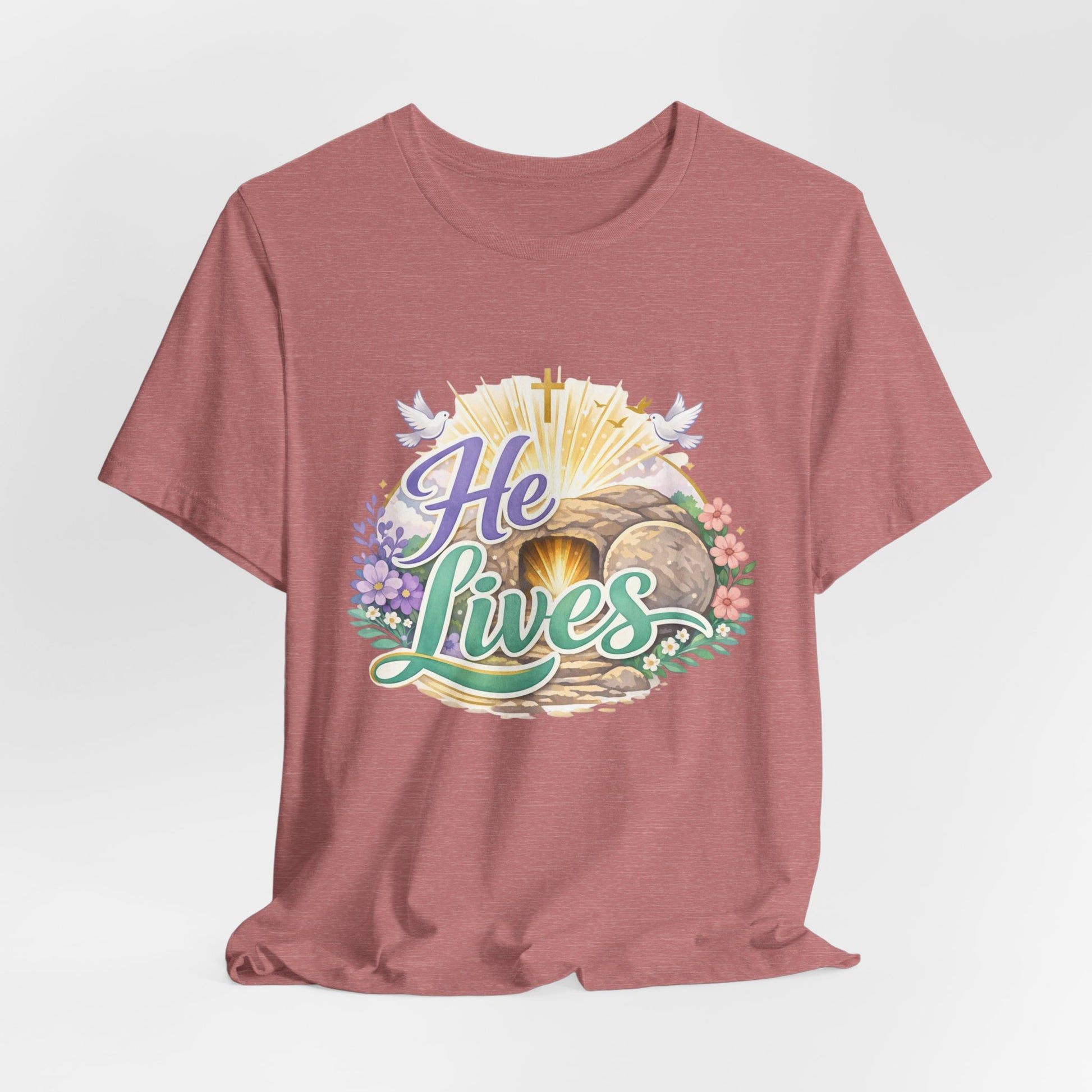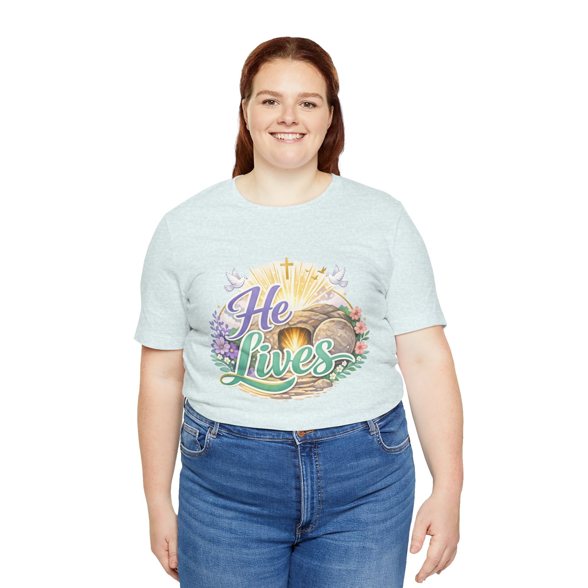 This soft, lightweight tee carries a quiet, hopeful message: a stylized depiction of Jesus’ empty tomb paired with the simple declaration “He Lives.” Wear it to carry a sense of calm resurrection joy through everyday routines — whether you’re heading to a small group, walking to sunrise service, or sitting with friends after church. The crew neckline and retail fit keep the silhouette clean so the artwork is the focus. It layers easily under a cardigan or jacket, and the breathable Airlume cotton feels gentle against the skin during long spring mornings or cool summer evenings. For people who find strength in faith, this shirt reads like a private affirmation and a gentle conversation starter in community settings and seasonal gatherings.