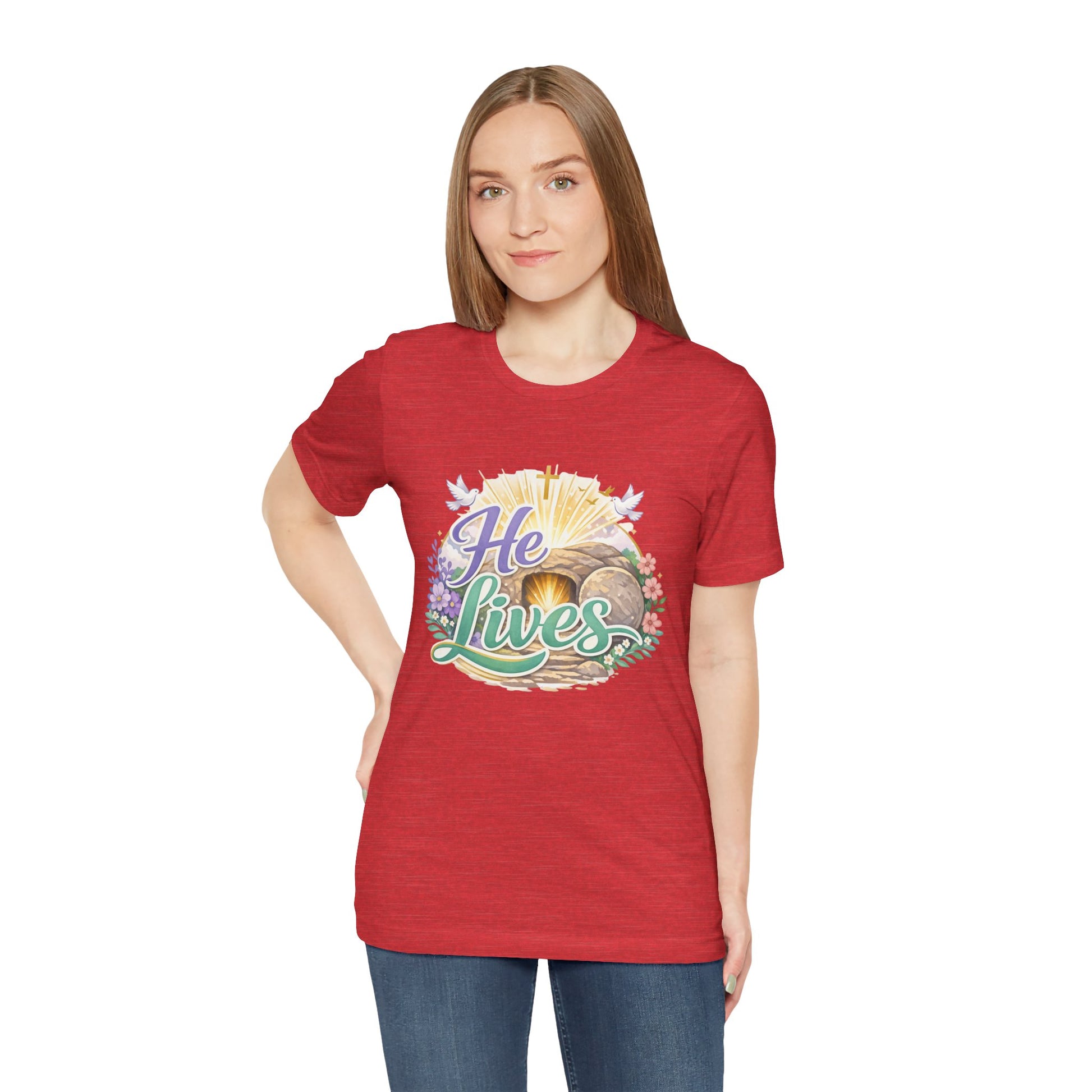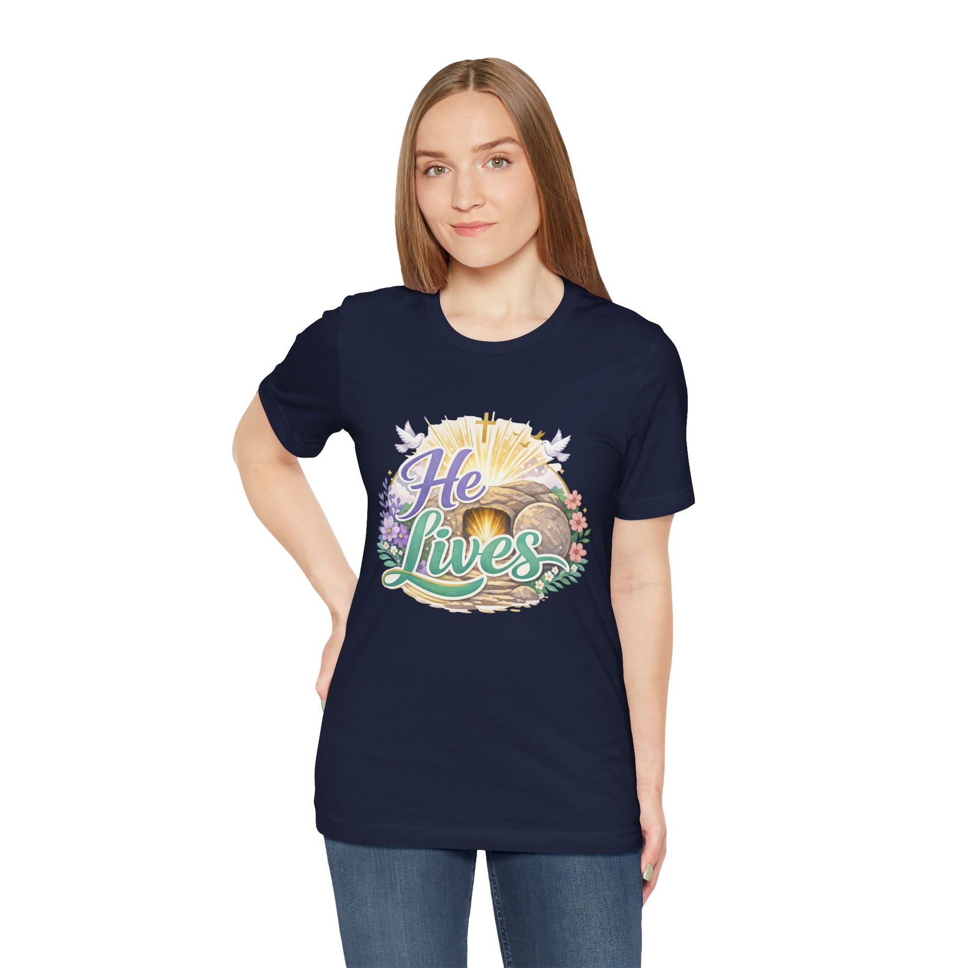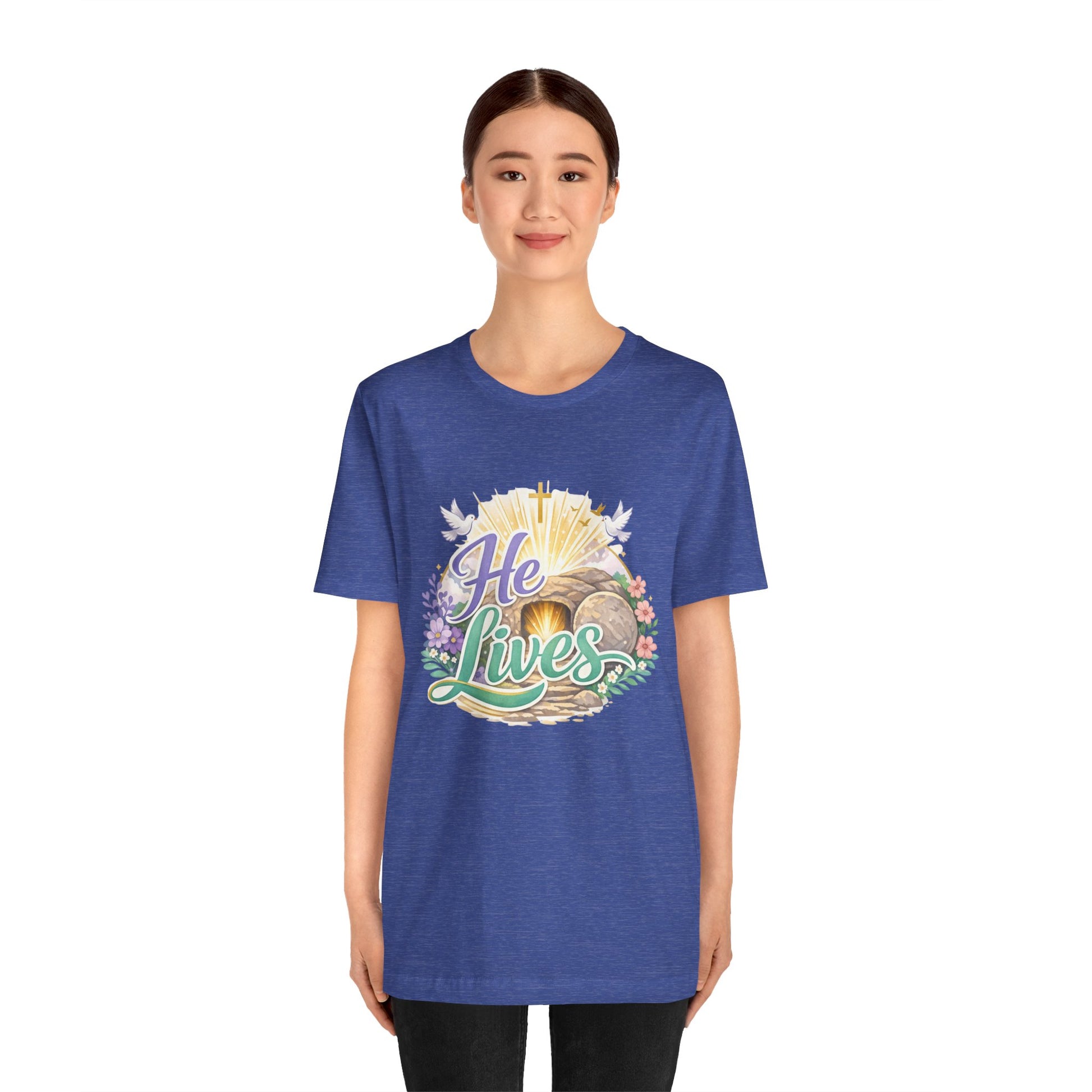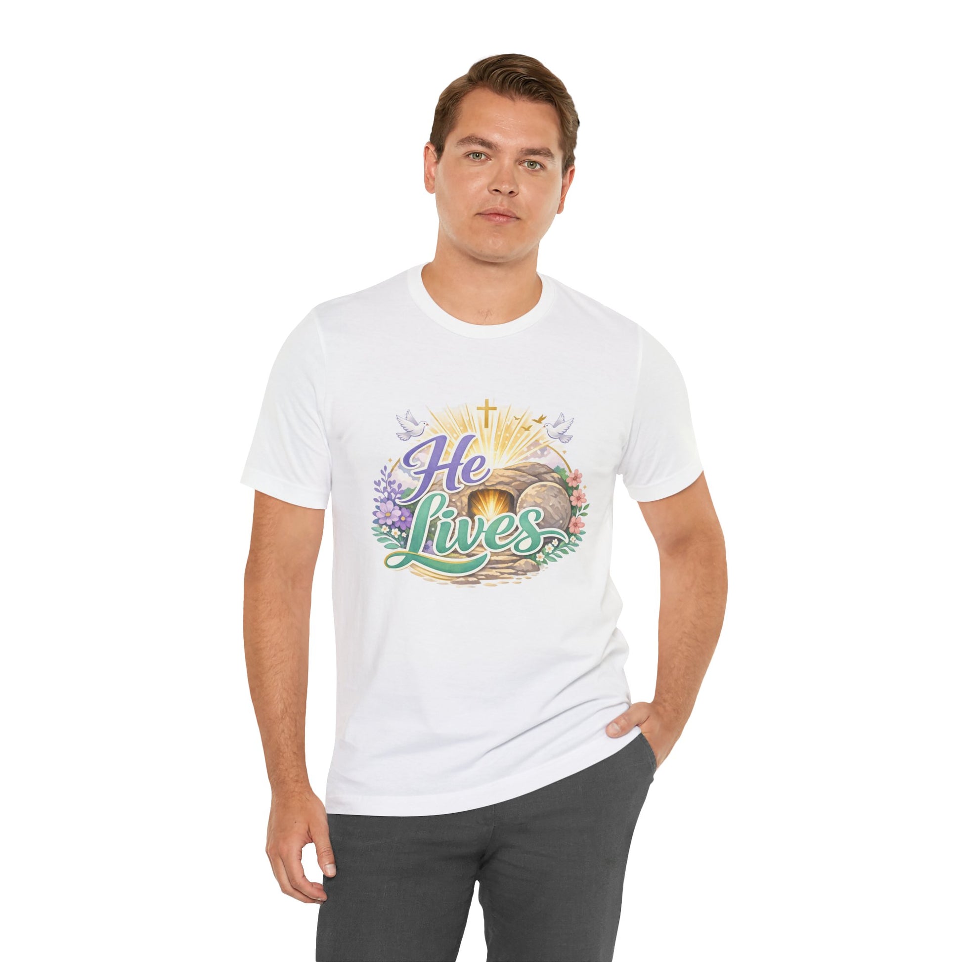 This soft, lightweight tee carries a quiet, hopeful message: a stylized depiction of Jesus’ empty tomb paired with the simple declaration “He Lives.” Wear it to carry a sense of calm resurrection joy through everyday routines — whether you’re heading to a small group, walking to sunrise service, or sitting with friends after church. The crew neckline and retail fit keep the silhouette clean so the artwork is the focus. It layers easily under a cardigan or jacket, and the breathable Airlume cotton feels gentle against the skin during long spring mornings or cool summer evenings. For people who find strength in faith, this shirt reads like a private affirmation and a gentle conversation starter in community settings and seasonal gatherings.