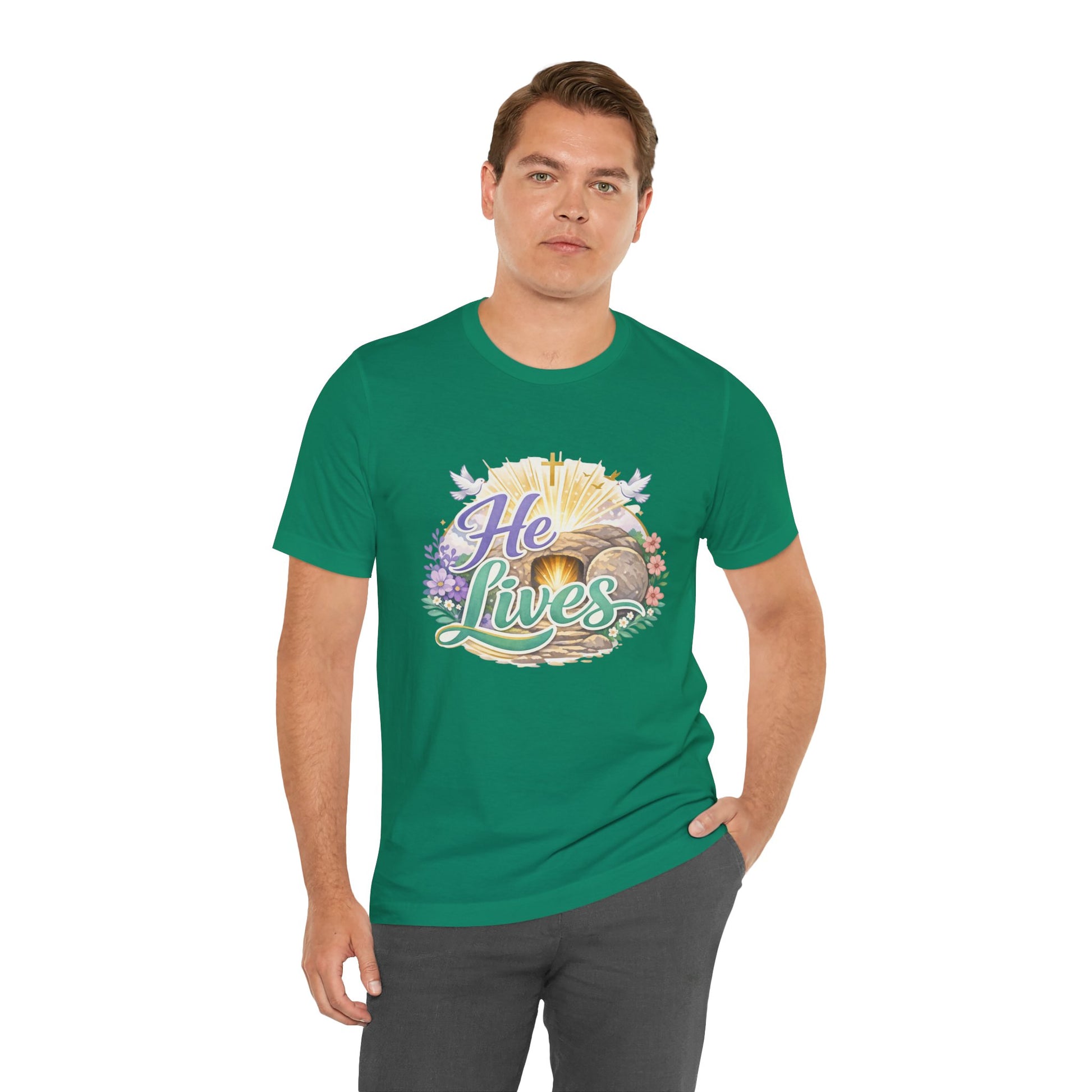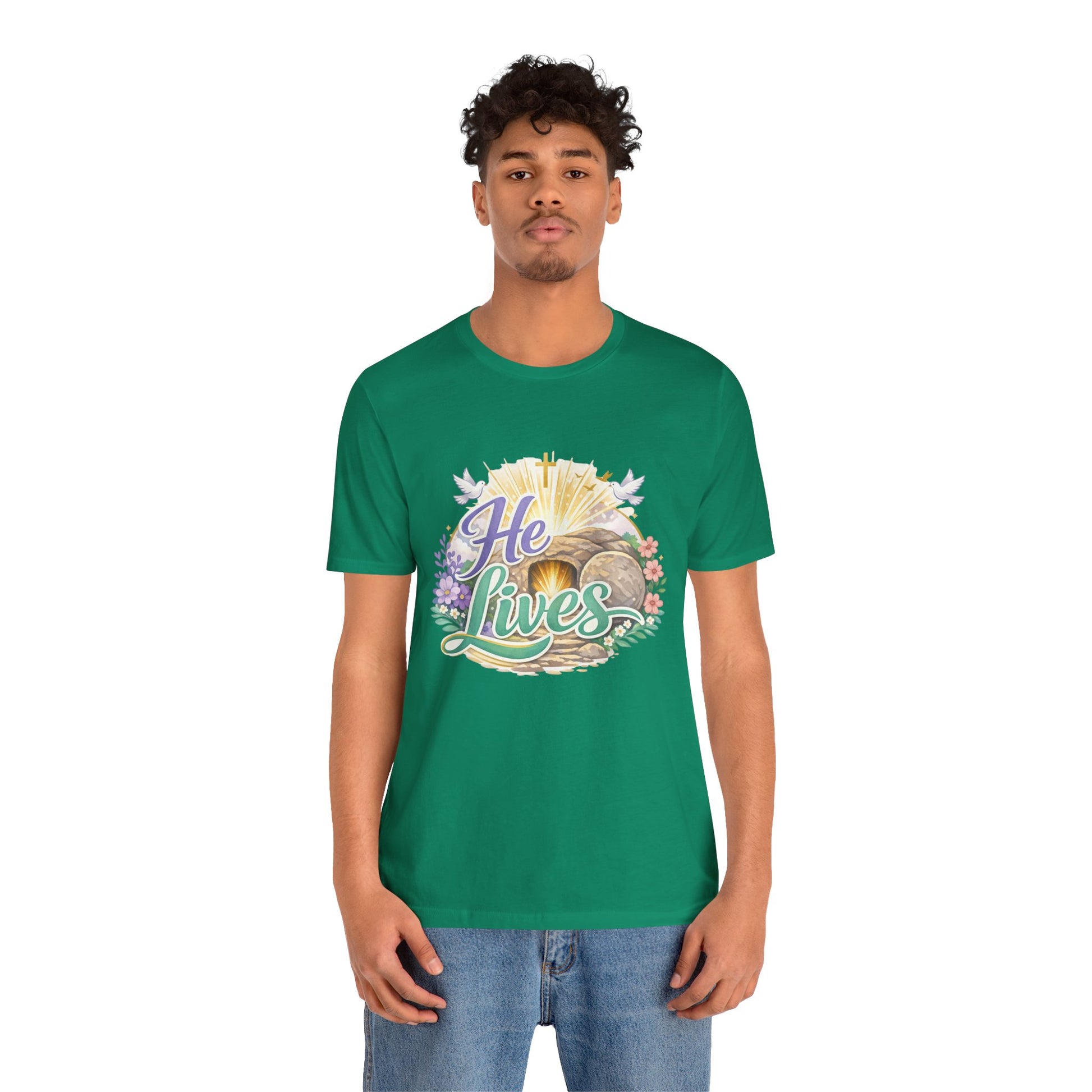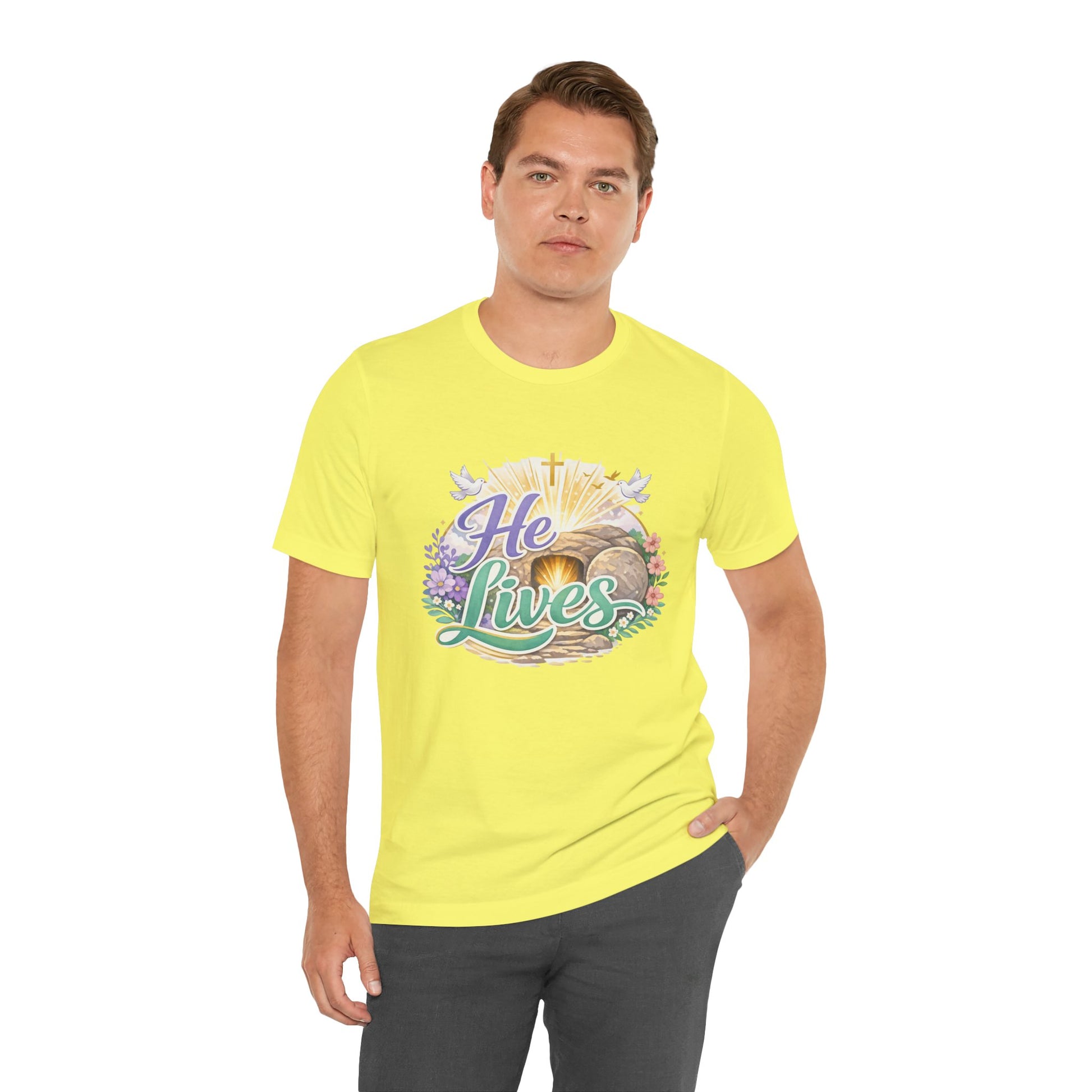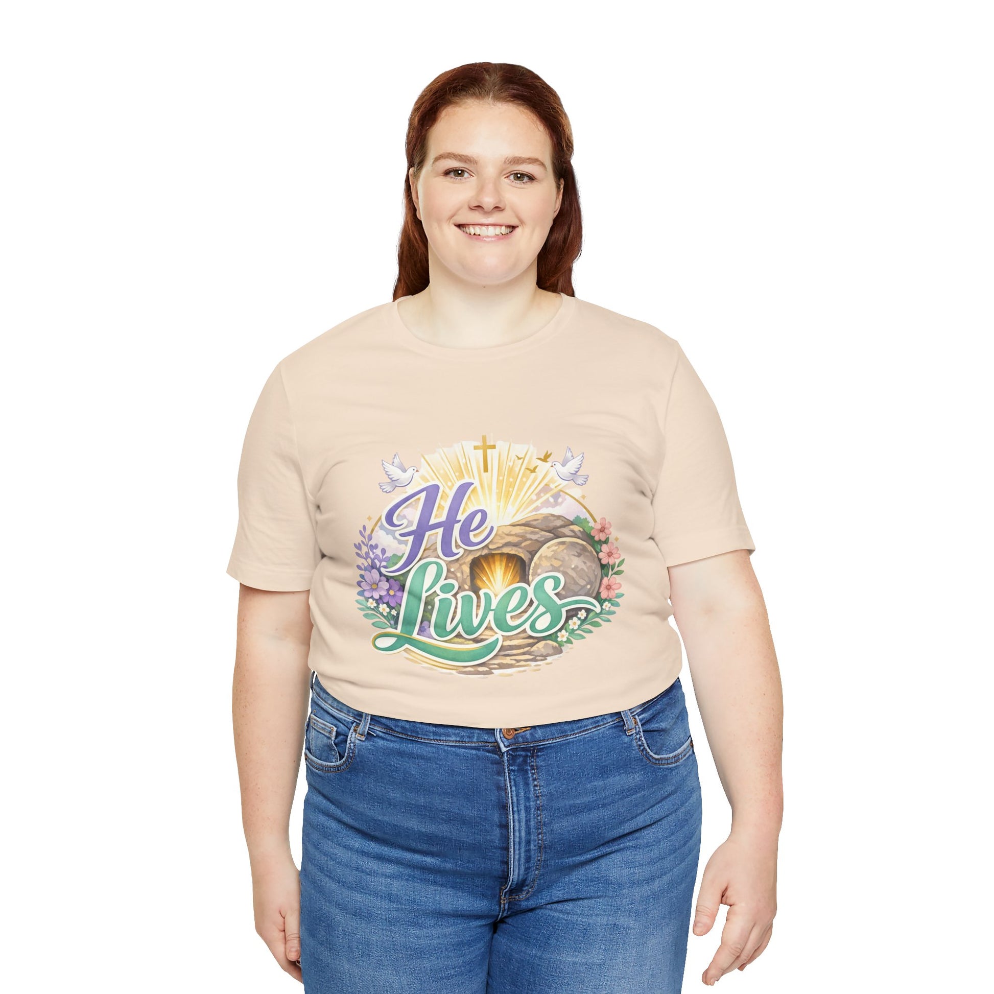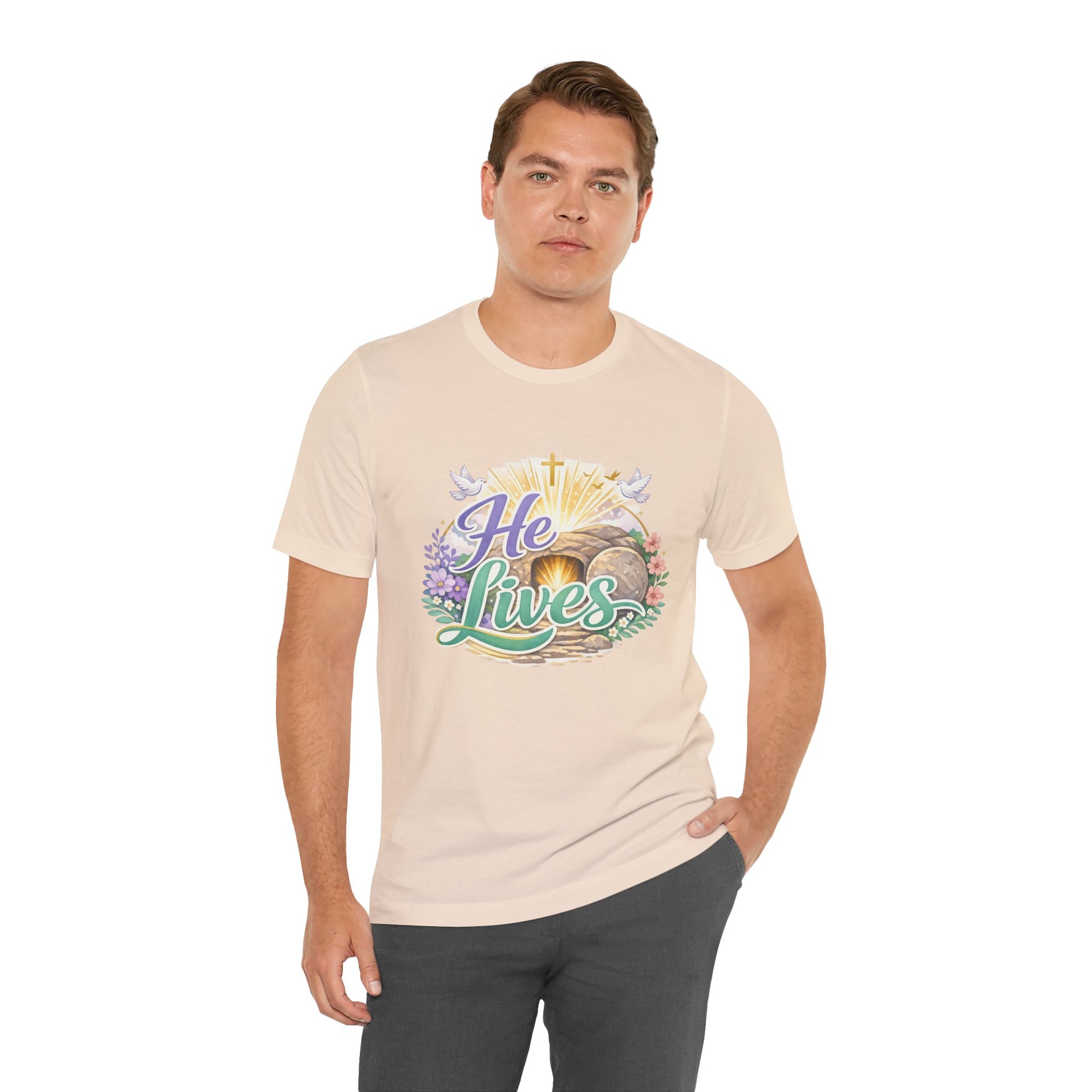 This soft, lightweight tee carries a quiet, hopeful message: a stylized depiction of Jesus’ empty tomb paired with the simple declaration “He Lives.” Wear it to carry a sense of calm resurrection joy through everyday routines — whether you’re heading to a small group, walking to sunrise service, or sitting with friends after church. The crew neckline and retail fit keep the silhouette clean so the artwork is the focus. It layers easily under a cardigan or jacket, and the breathable Airlume cotton feels gentle against the skin during long spring mornings or cool summer evenings. For people who find strength in faith, this shirt reads like a private affirmation and a gentle conversation starter in community settings and seasonal gatherings.