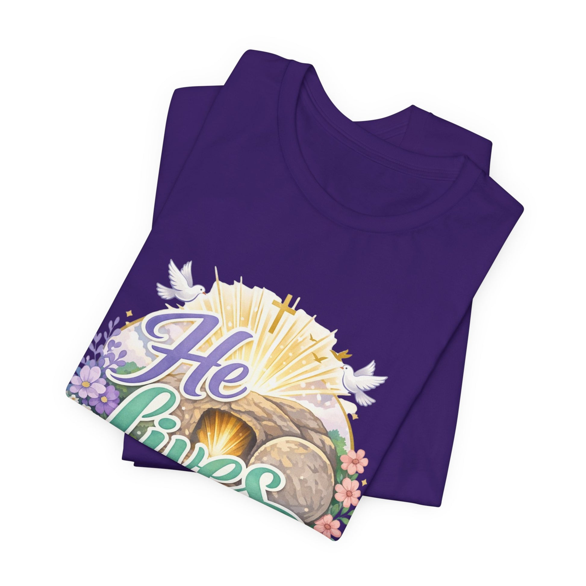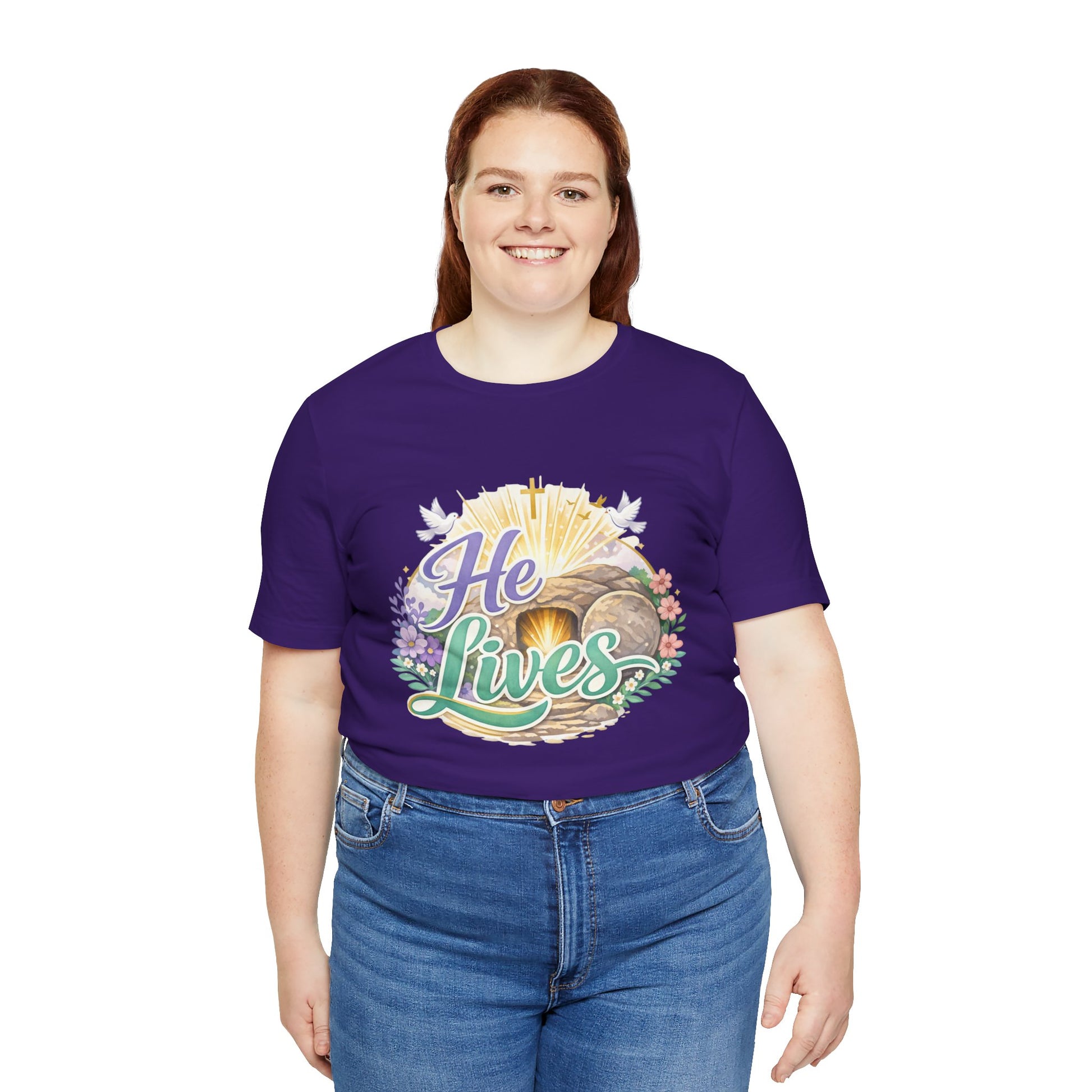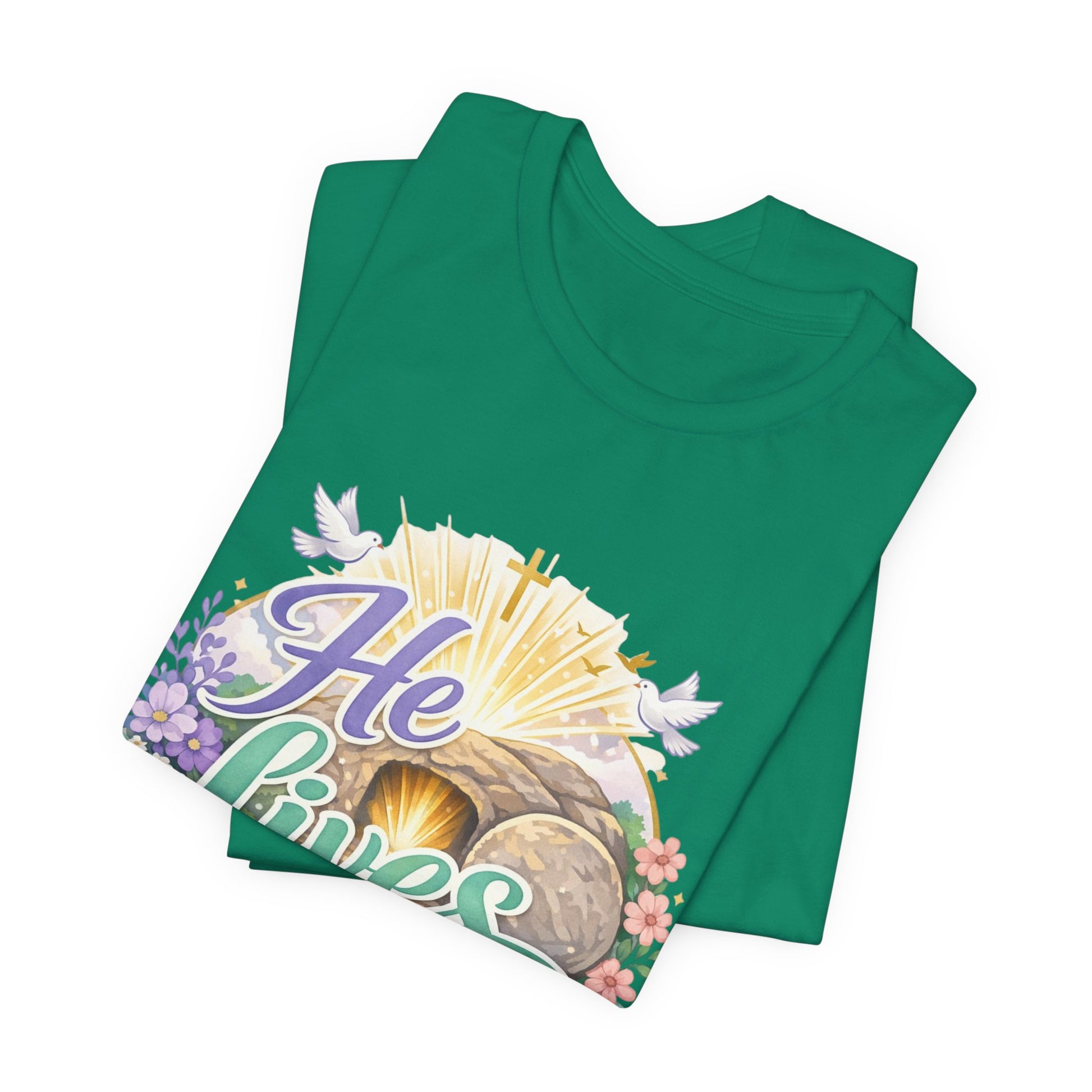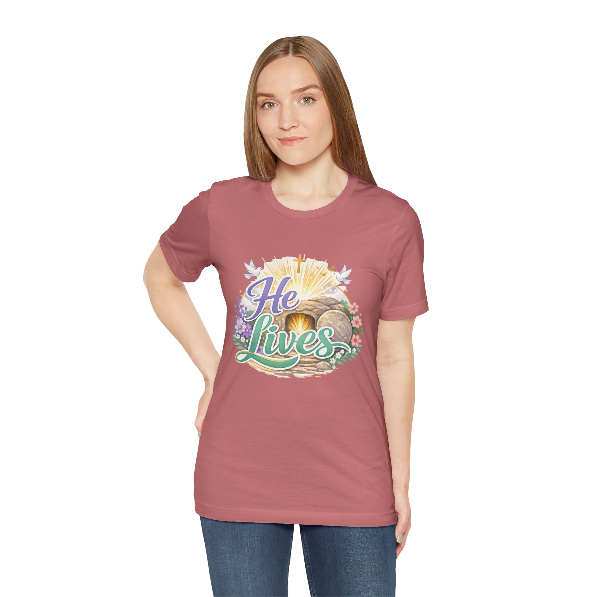 This soft, lightweight tee carries a quiet, hopeful message: a stylized depiction of Jesus’ empty tomb paired with the simple declaration “He Lives.” Wear it to carry a sense of calm resurrection joy through everyday routines — whether you’re heading to a small group, walking to sunrise service, or sitting with friends after church. The crew neckline and retail fit keep the silhouette clean so the artwork is the focus. It layers easily under a cardigan or jacket, and the breathable Airlume cotton feels gentle against the skin during long spring mornings or cool summer evenings. For people who find strength in faith, this shirt reads like a private affirmation and a gentle conversation starter in community settings and seasonal gatherings.