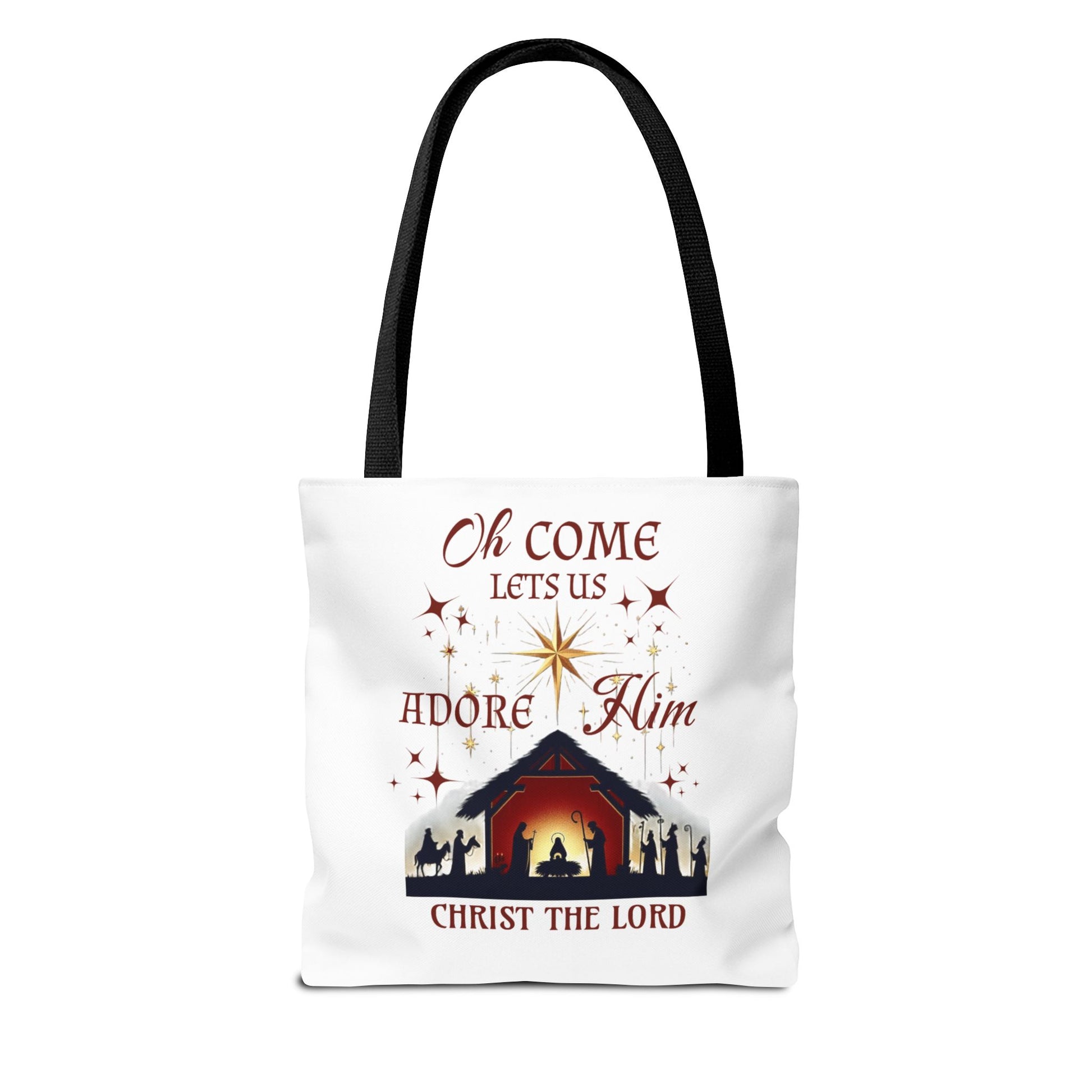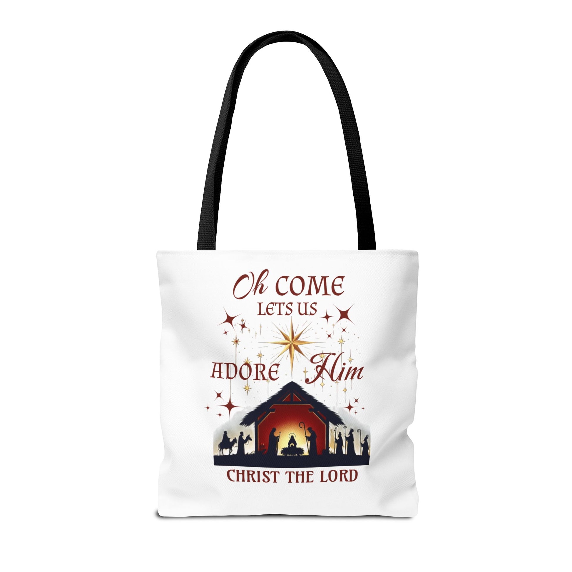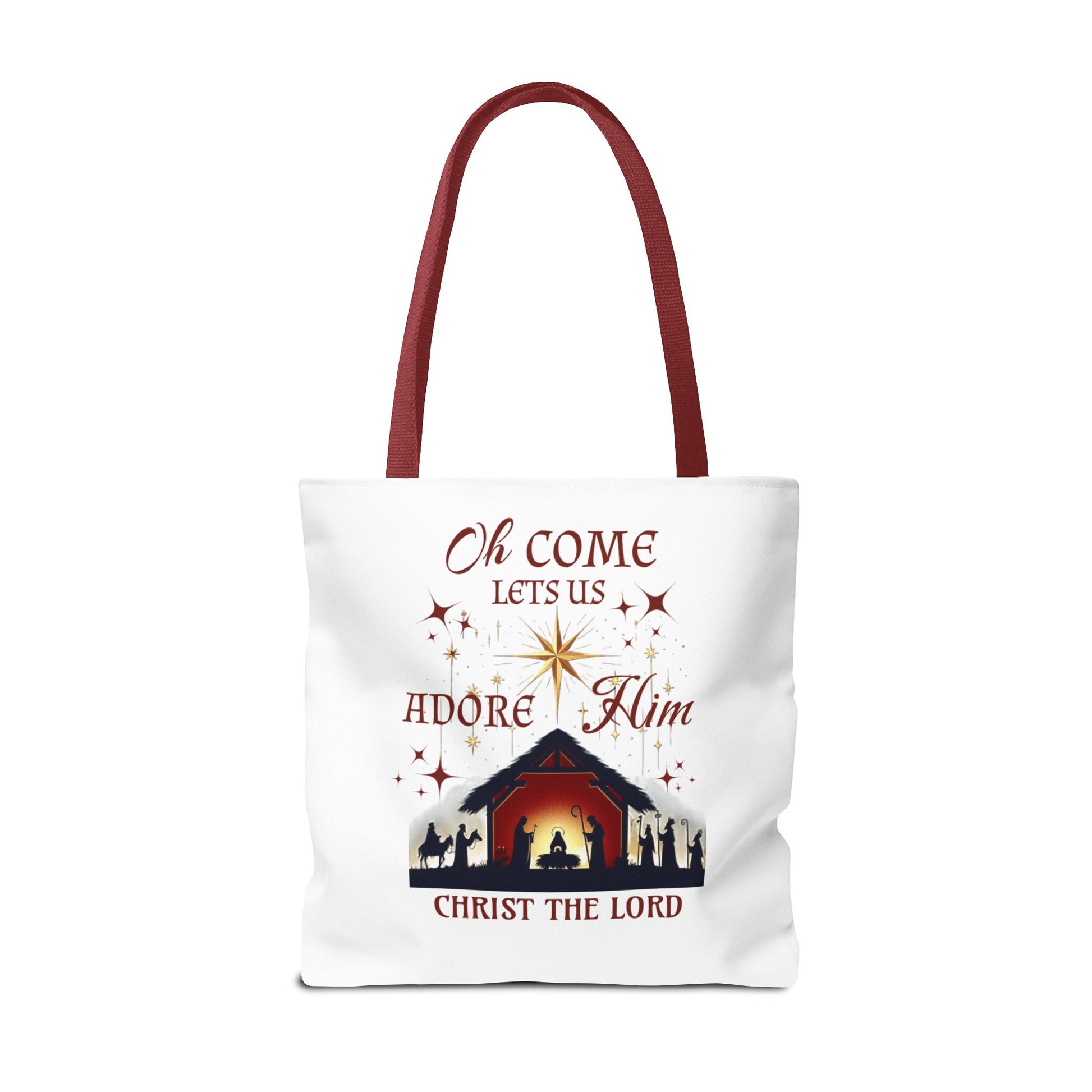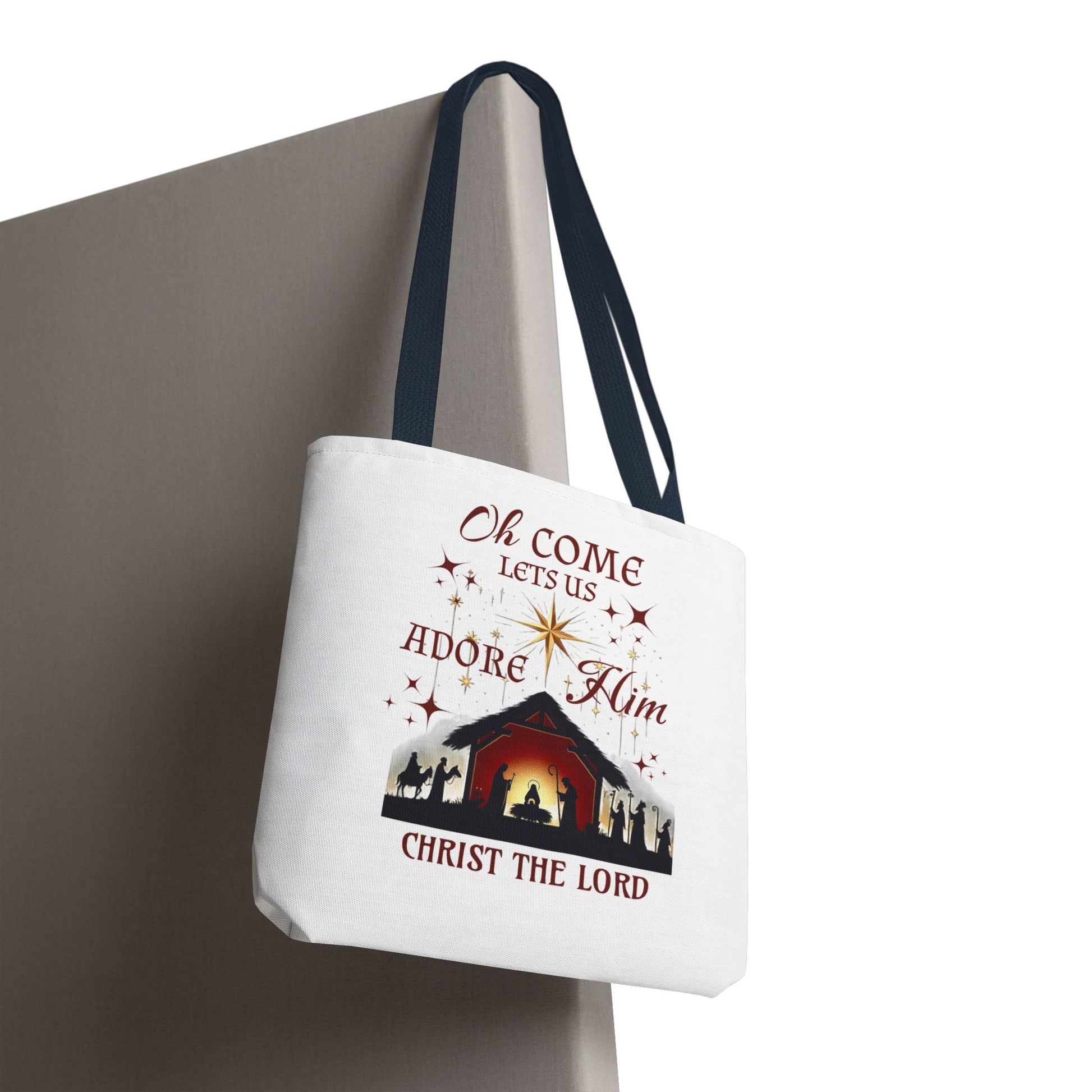 Nativity Scene Tote Bag with 'Oh come let us adore Him, Christ the Lord' Phrase