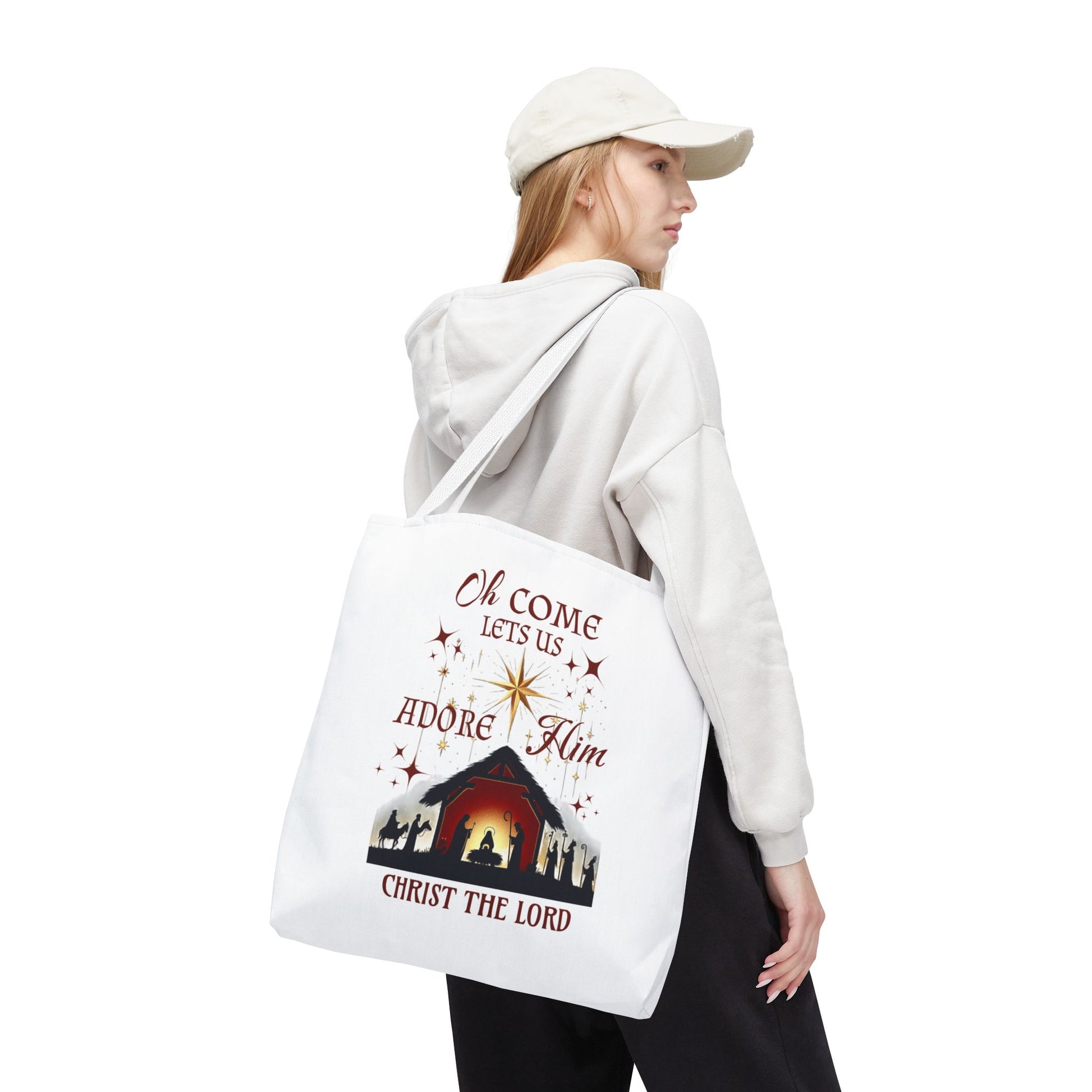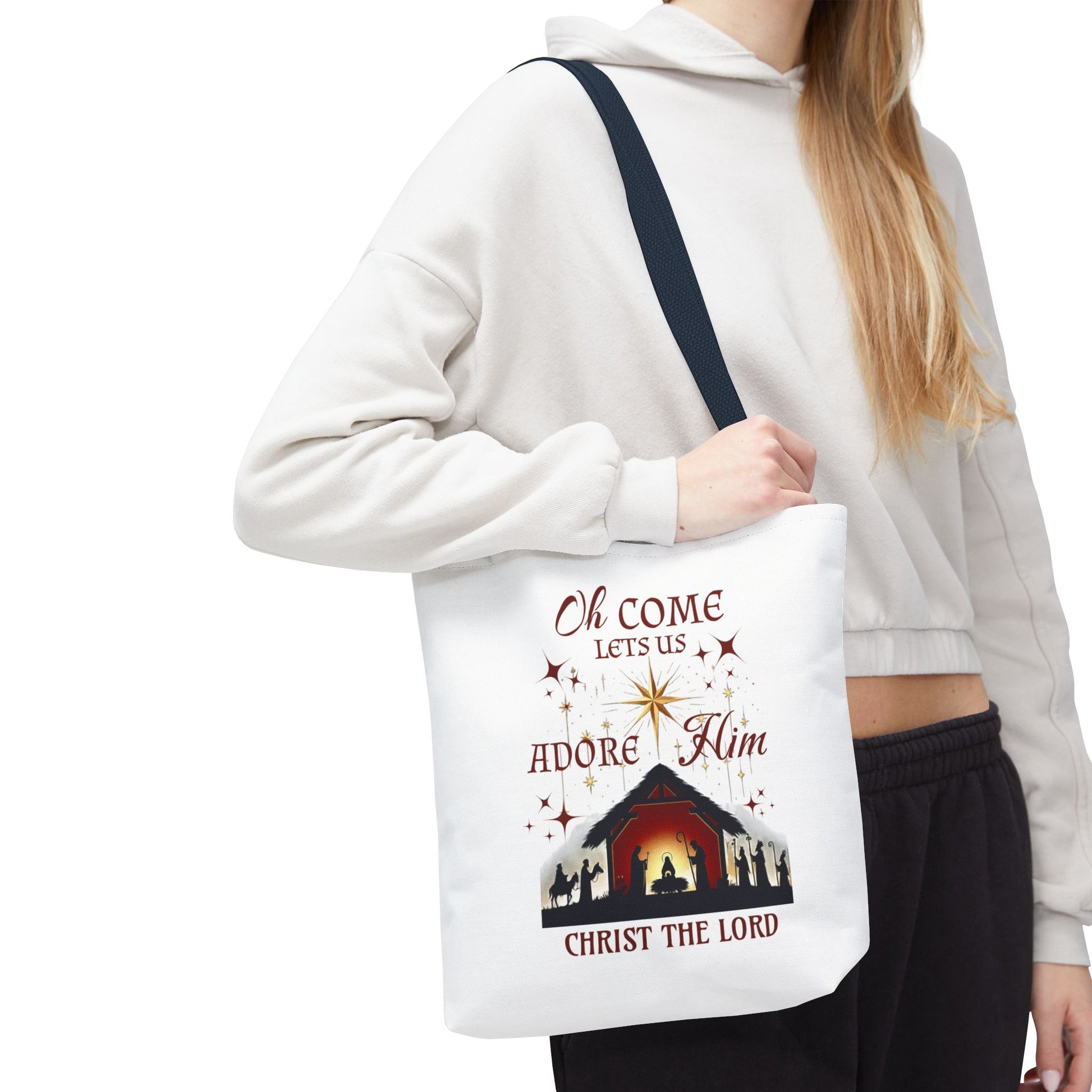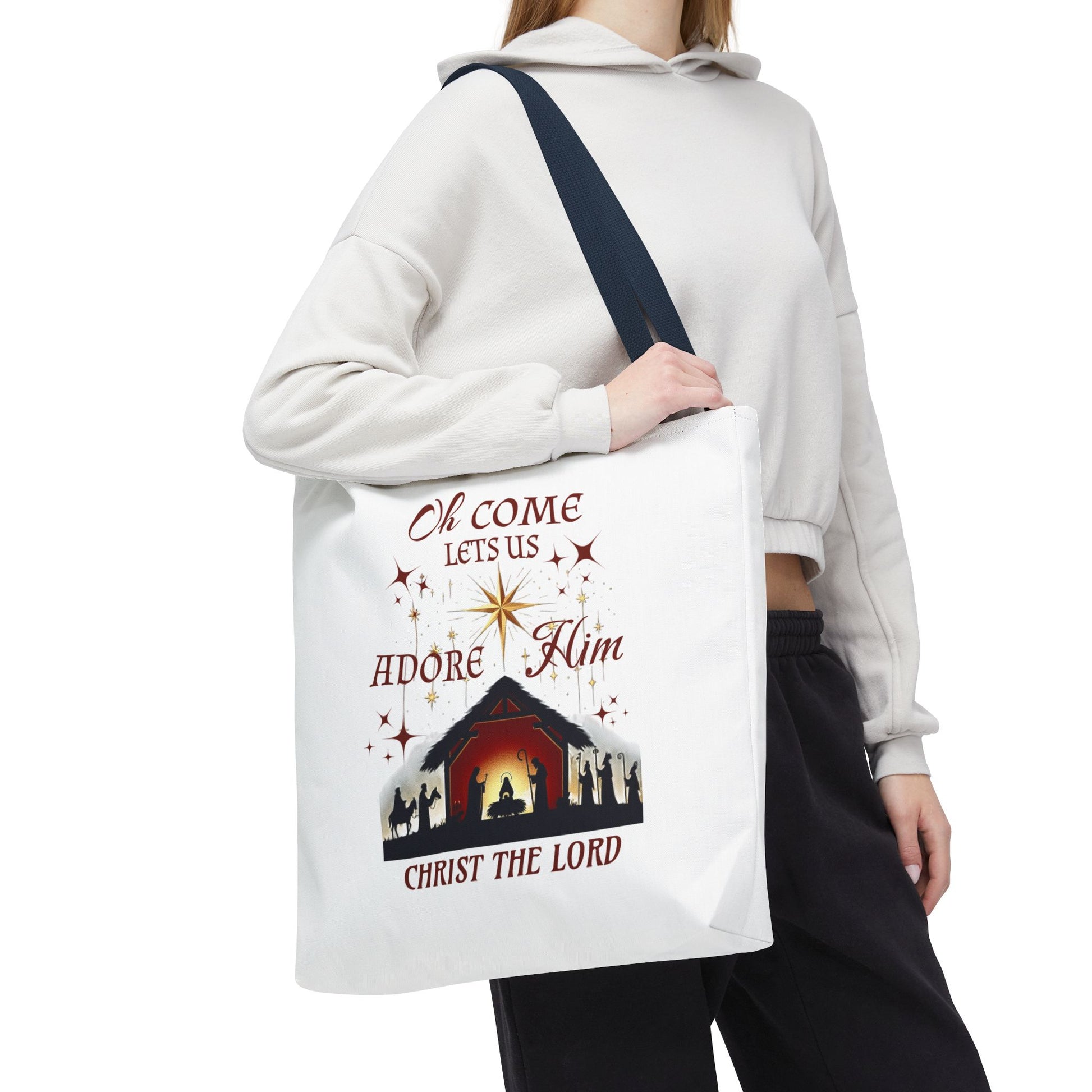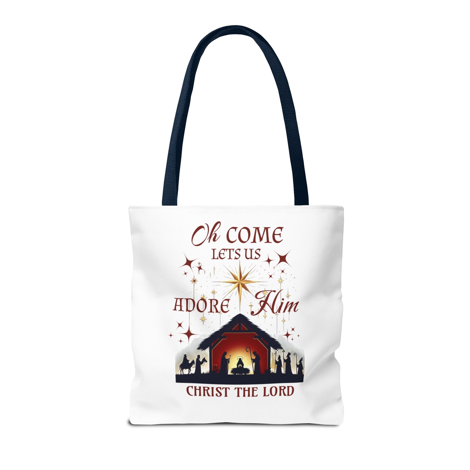 Nativity Scene Tote Bag with 'Oh come let us adore Him, Christ the Lord' Phrase