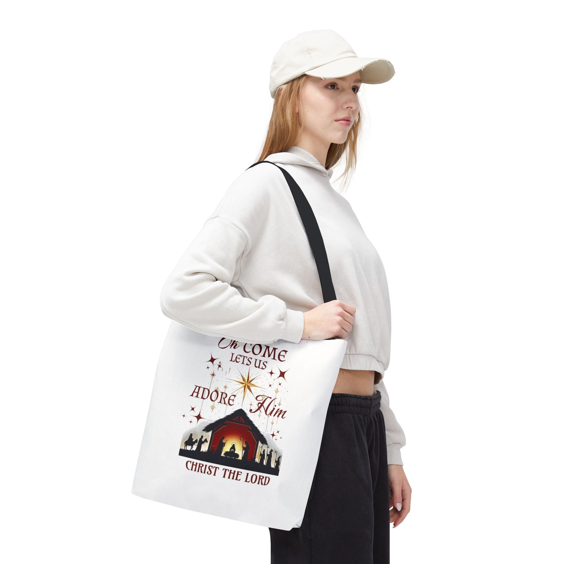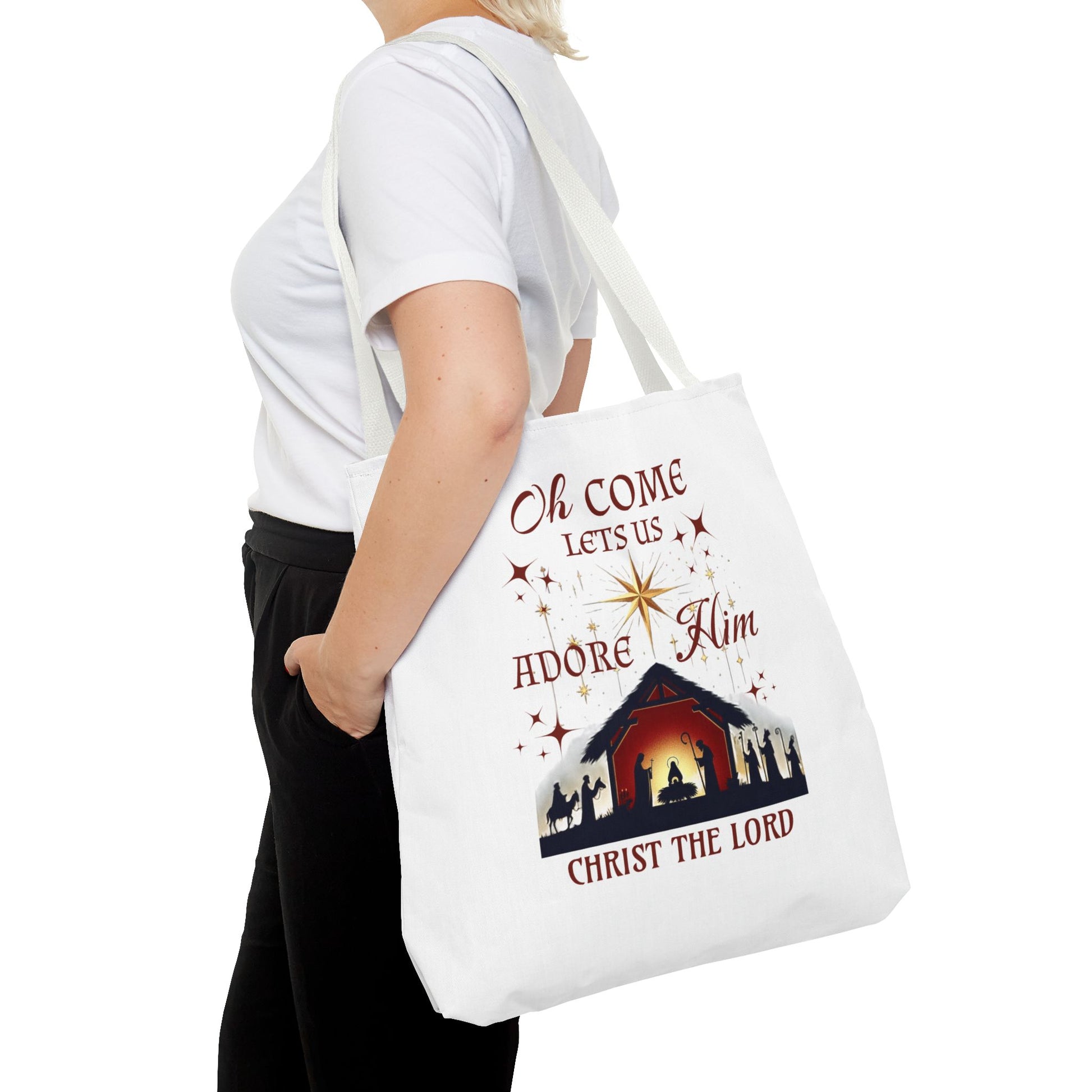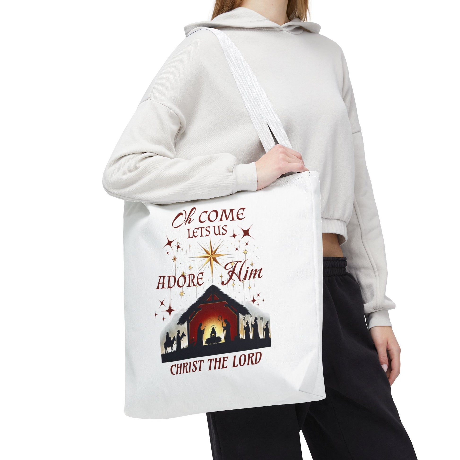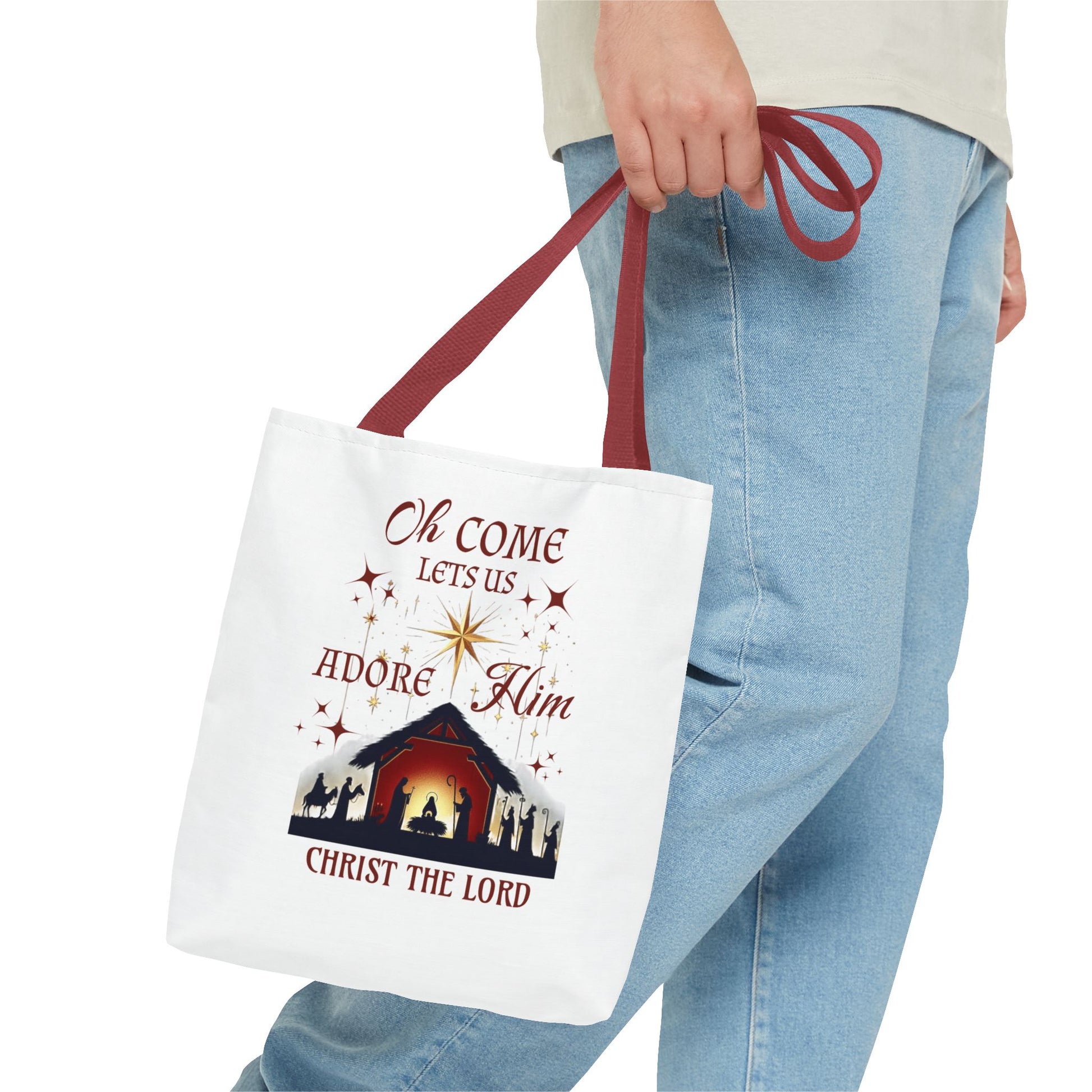Nativity Scene Tote Bag with 'Oh come let us adore Him, Christ the Lord' Phrase