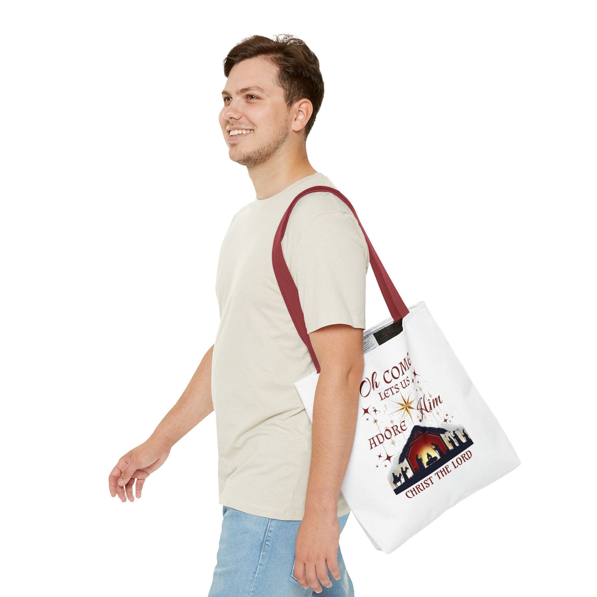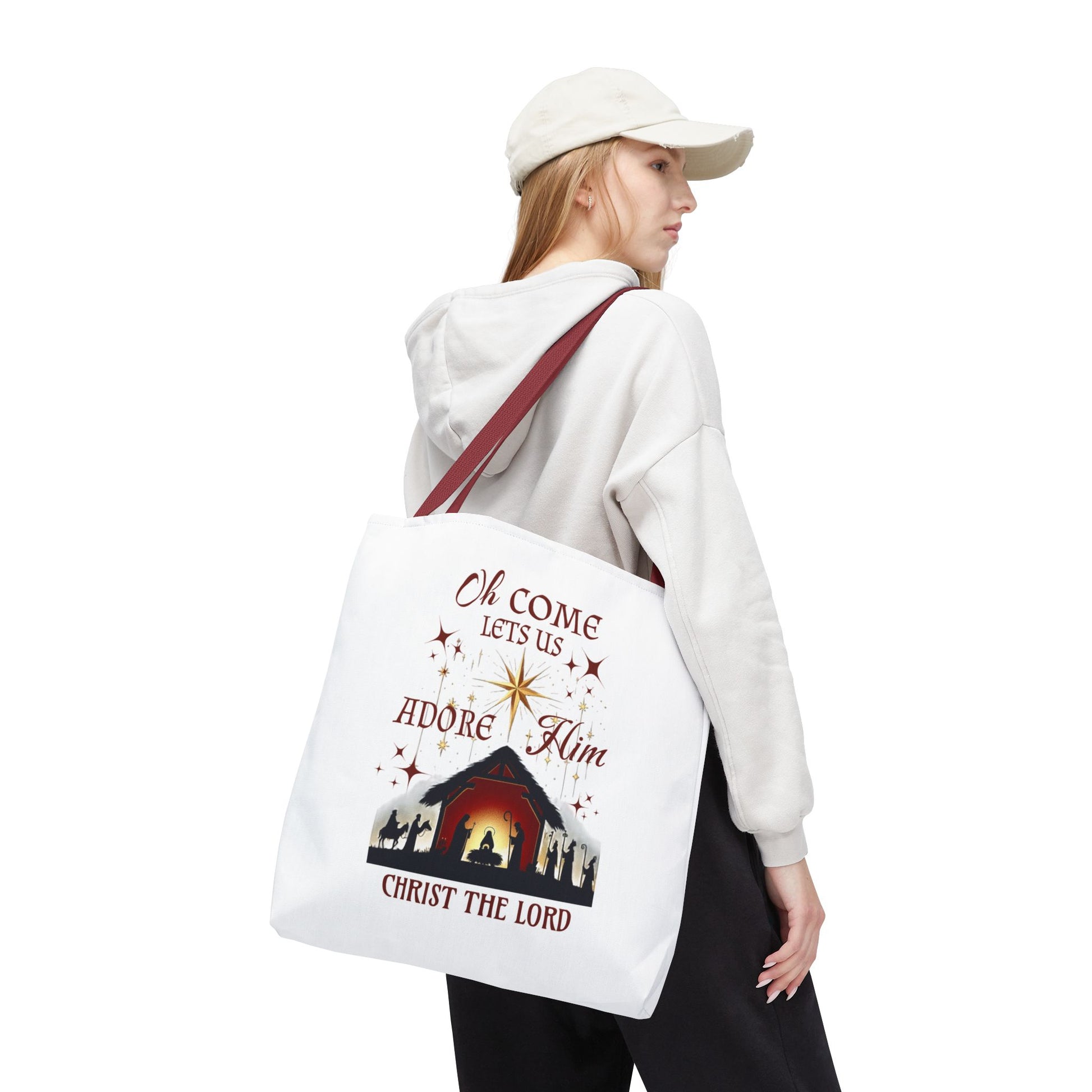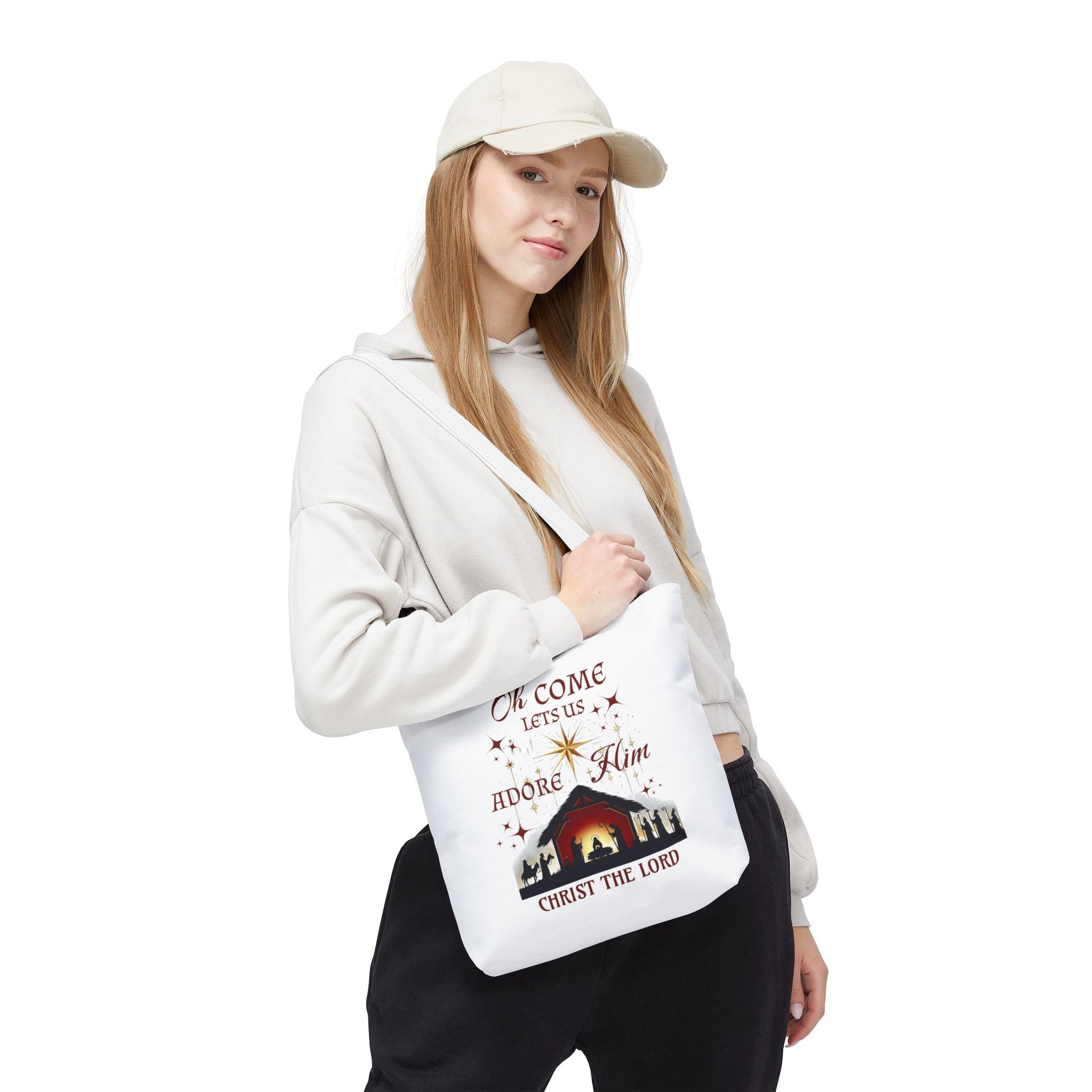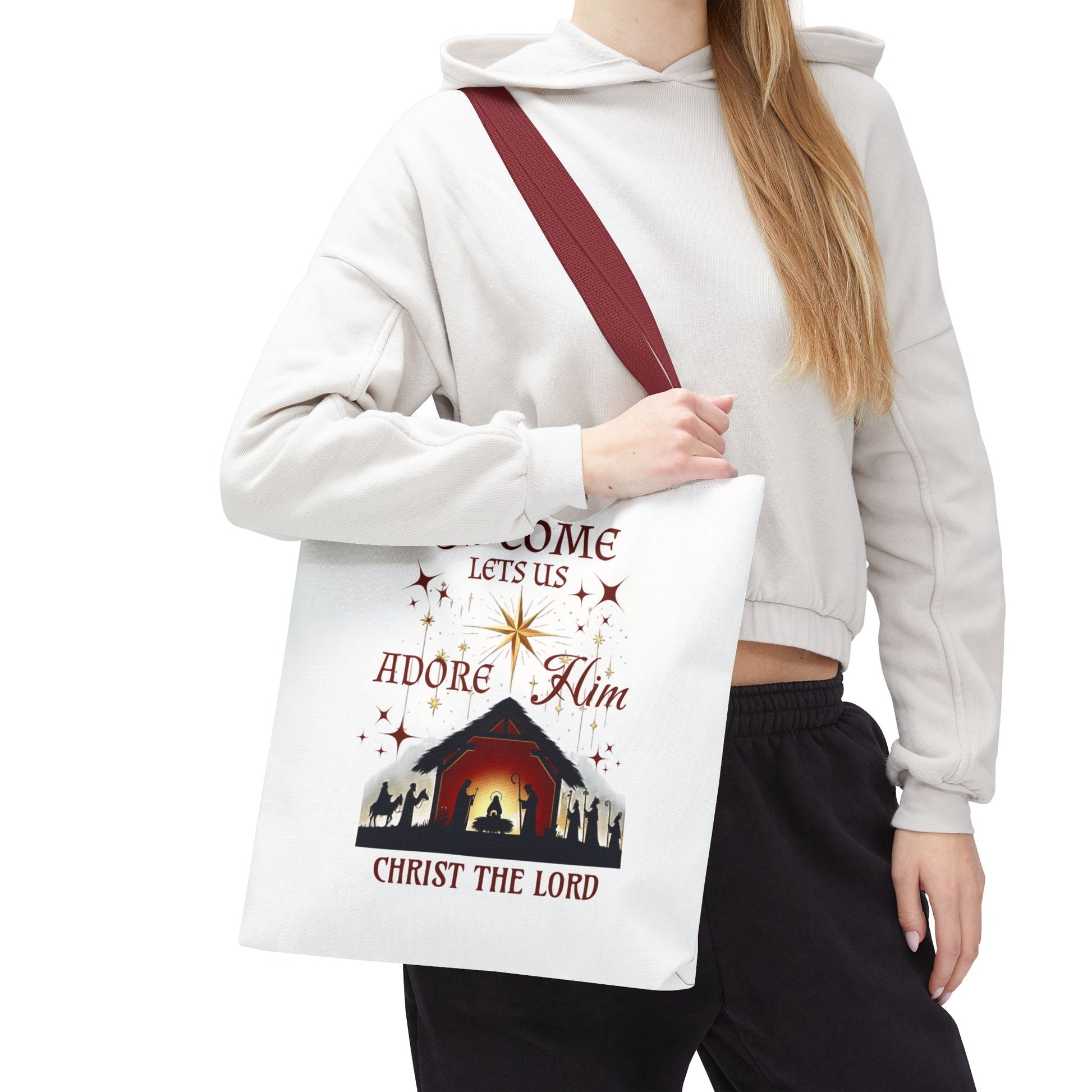 Nativity Scene Tote Bag with 'Oh come let us adore Him, Christ the Lord' Phrase