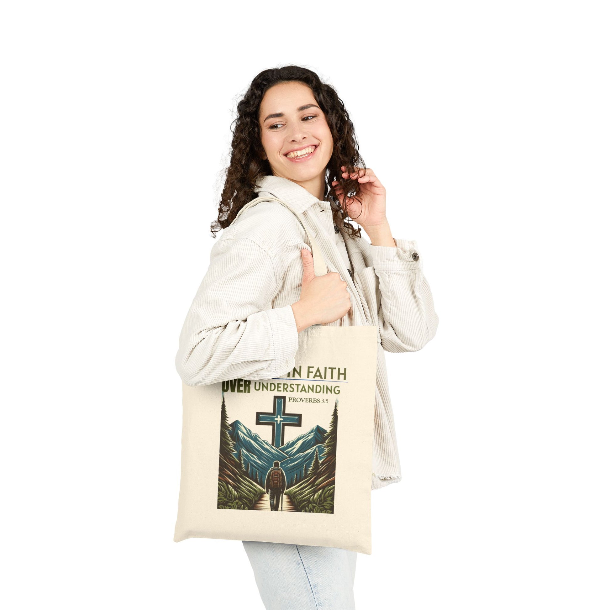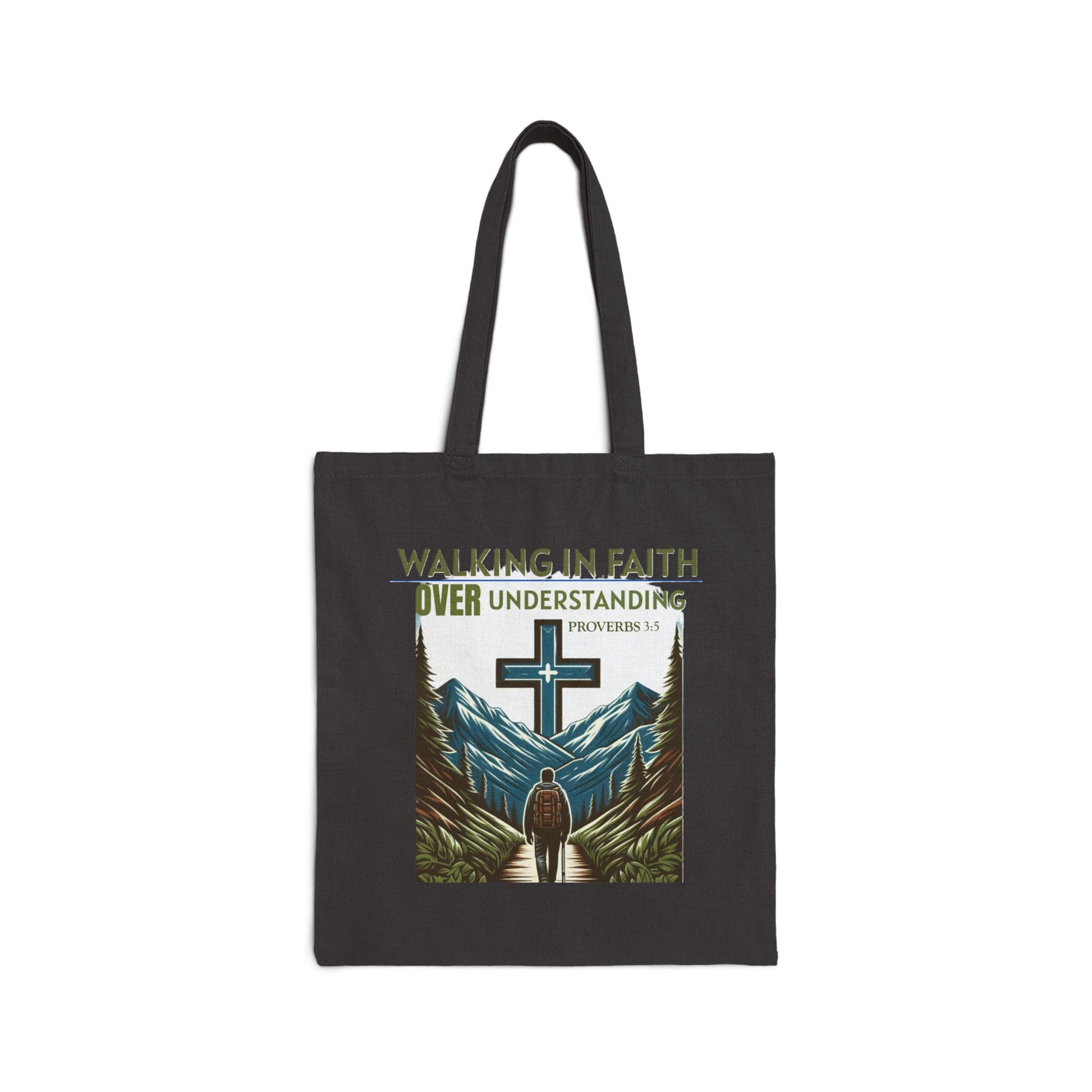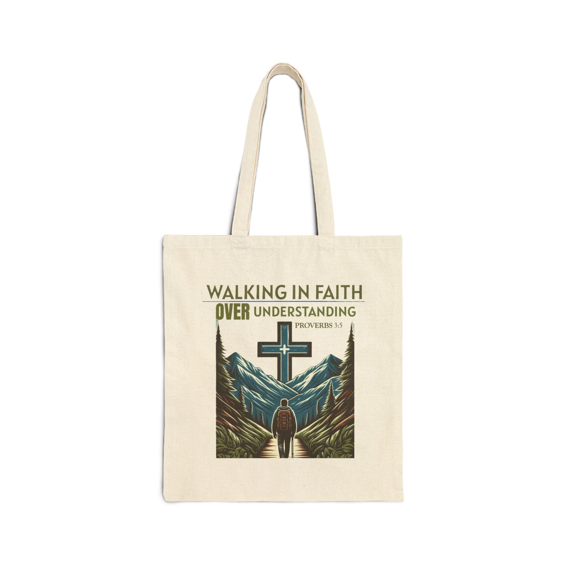 A durable and spacious tote bag featuring the Bible verse Proverbs 3:5 "WALKING IN FAITH OVER UNDERSTANDING". Perfect for those who want to carry their faith with them wherever they go. Ideal for adults looking for a practical and inspirational accessory. Relevant for religious holidays, bible studies, and everyday use.