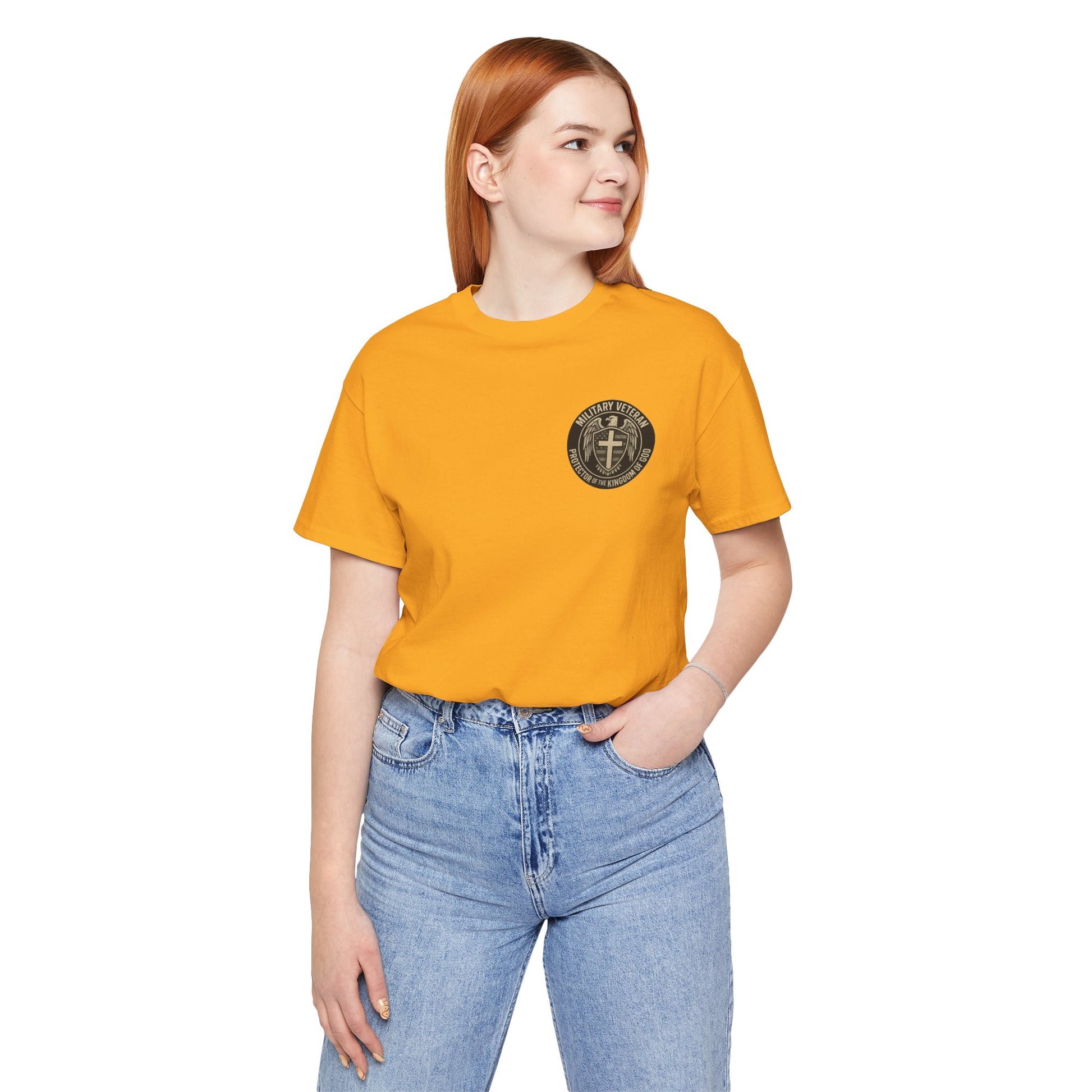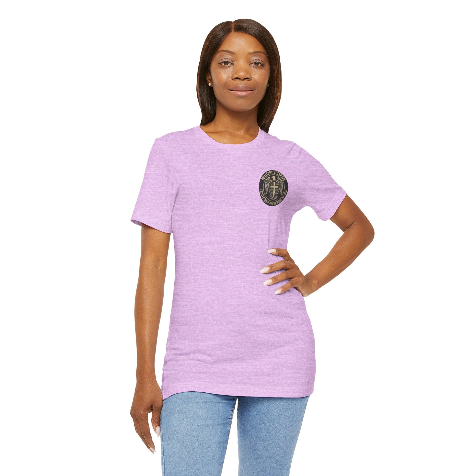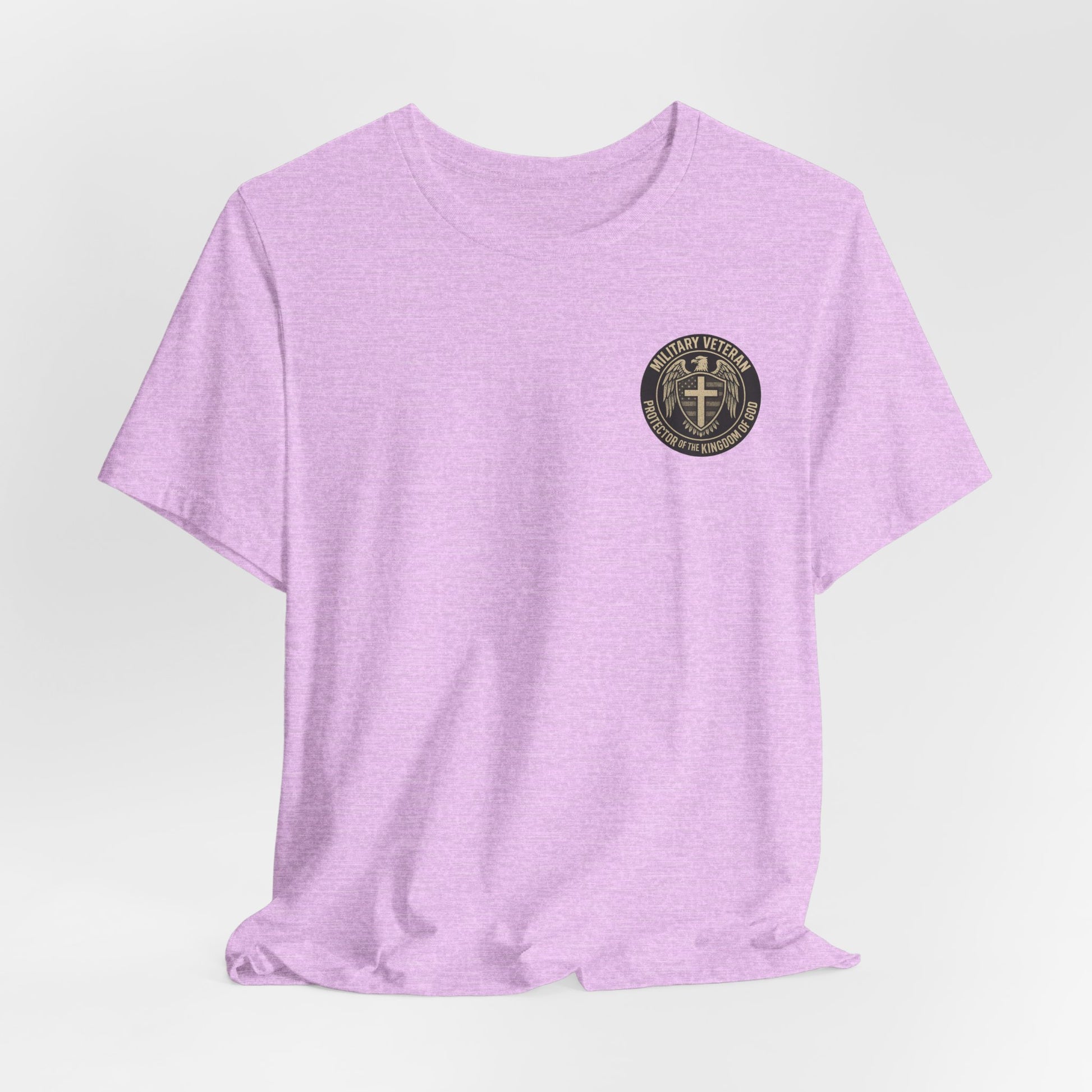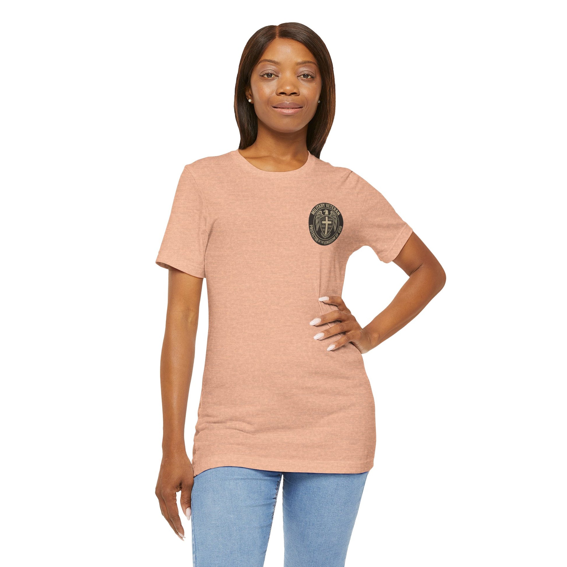 This lightweight jersey tee carries a quiet, steadfast message: ‘Military Veteran — Protector of the Kingdom of God.’ The soft, breathable cotton feels like an easy second skin, made to move with you whether you’re heading to a Sunday service, a reunion with fellow veterans, or a slow morning of reflection. The bold yet reverent wording sits confidently on the chest and sleeves, a low-key declaration of service and faith that reads like a shared nod between those who understand sacrifice.